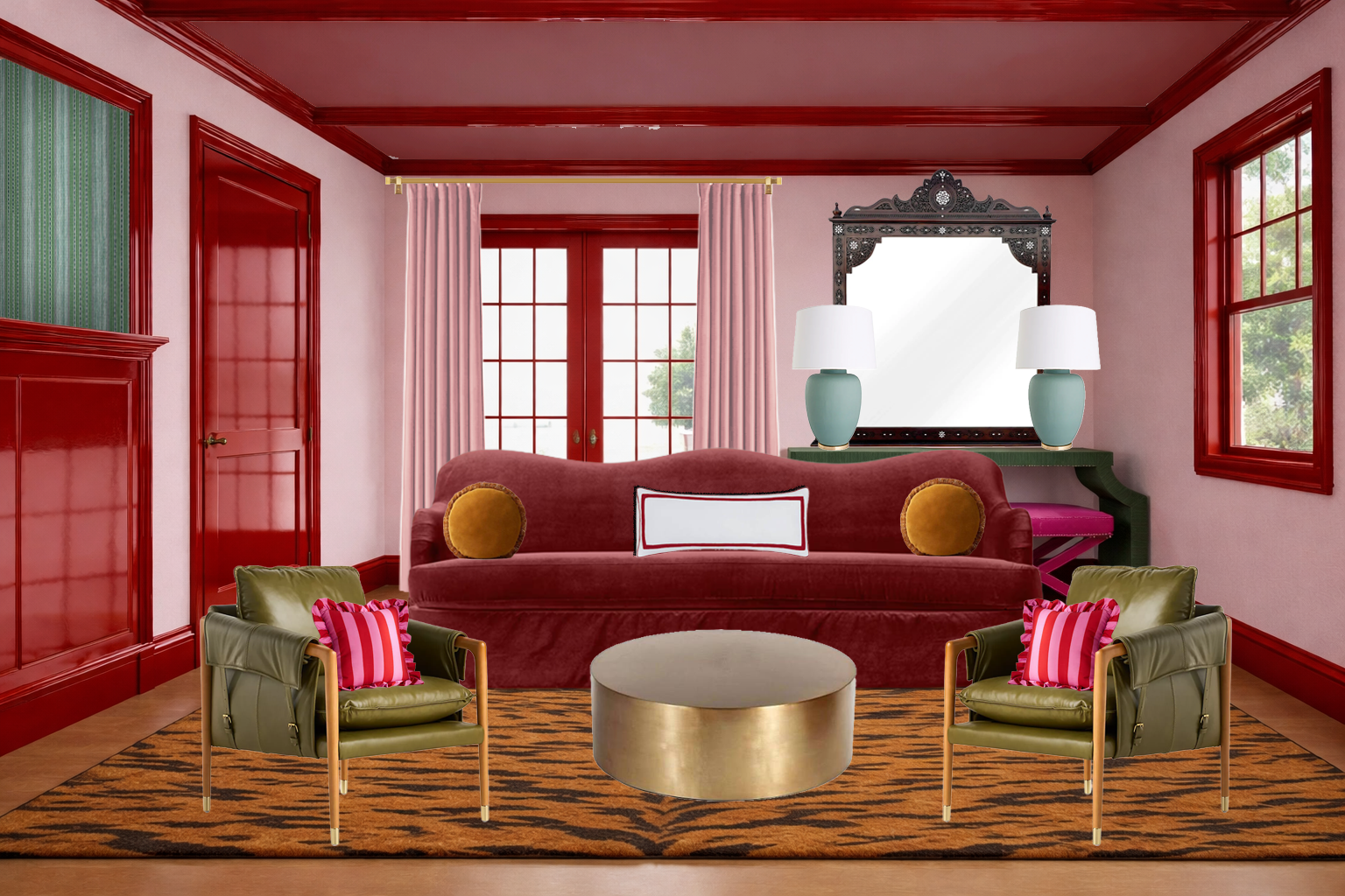 make this look photo realistic add a reflection in the mirror keep ceiling beams where they are but make them slightly larger