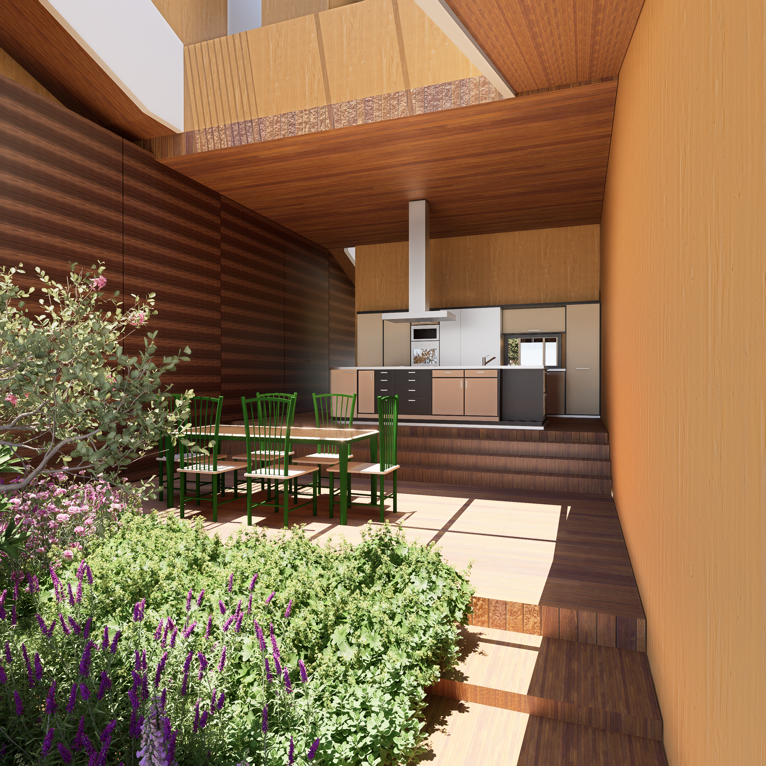 cambia las texturas de los materiales como en la imagend e referencia en el suelo y escaleras el mismo material que el suelo de imagen referencia en paredes y techo mismo material que la imagen de referencia en la parte izquierda aun que parece una pared son armarios pues cambialo a listones de madera vertical de suelo a techo la mesa y sillas cambialo por unas sillas y mesa de jardin exterior tipicas de vivienda moderna la cocina cambaila por completo sustituyendola por muebles y distribucion de cocina moderna como en la imagen de referencia pero mant n el formato y estilo de distribucion solo quiero que se vea mas moderna de madera manten la fentana peque a que se ve entre los muebles de cocina haz que los muebles sean de suelo a techo la vegetacion hazla mas bajita sustituyela por un jardin de casa muy bonito con plantas y arboles como rododendros arce japones etc haz que la luz sea unifor y adecuada a la imagen haz que sea hiper hiper realista la imagen