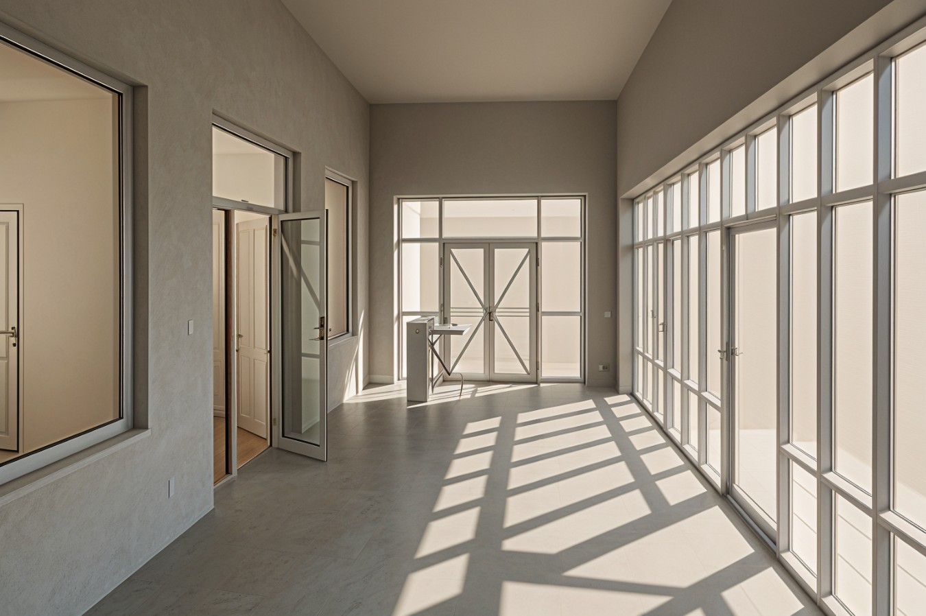 interior shot creative ultra modern design in light colors of the office lobby suspended creative ceiling with led lighting architecture