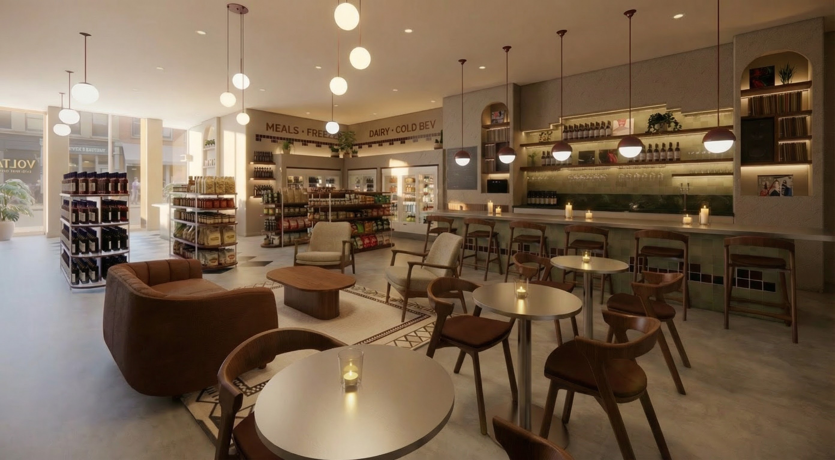 maintain everything exactly the same maintain all geometry colors furniture placement lighting camera angle and textures on the left side of the bar in the background on the bottom shelf of the archway put a vintage mcintosh tube amp maintain all other shelves exactly as they are brighten the foreground just a tad so the lighting isn t as dark and moody and contrasted soft even ambient light