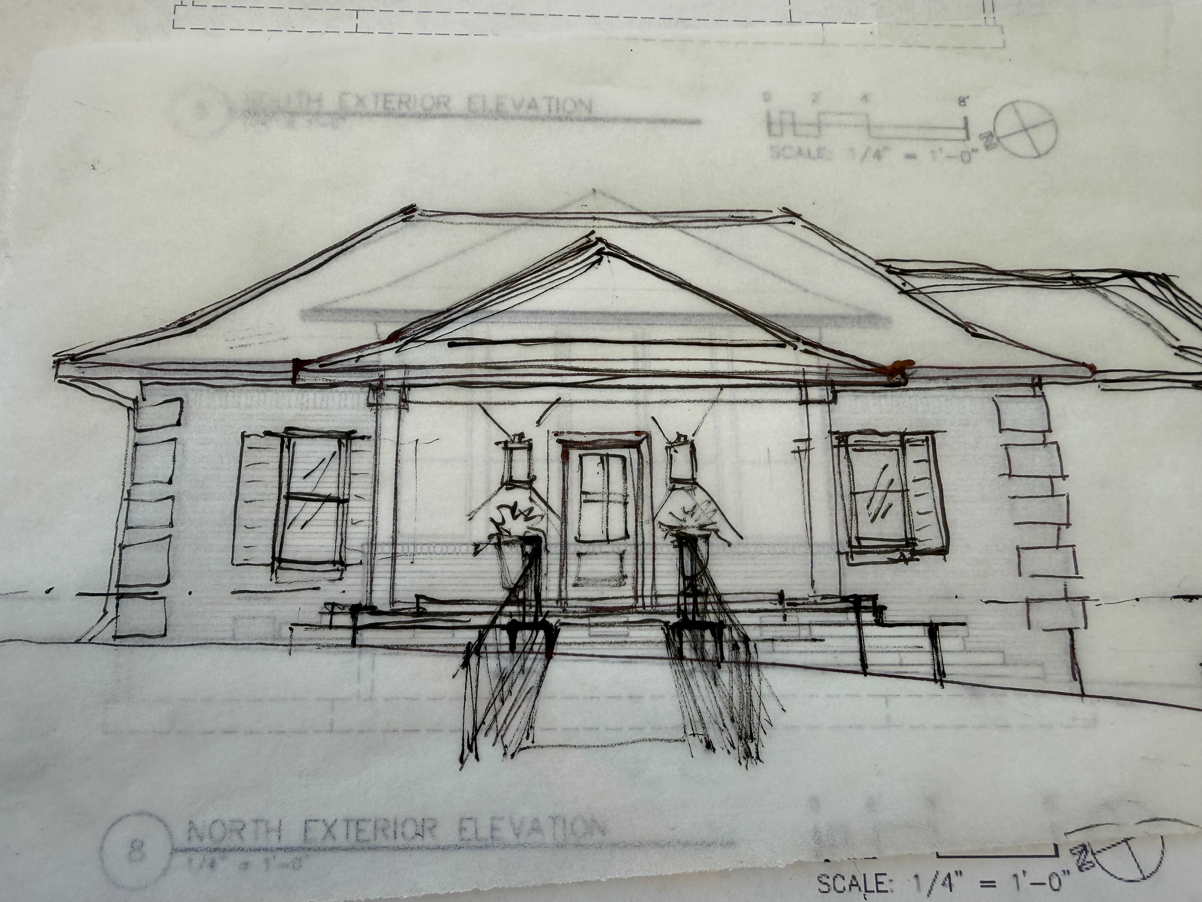 render this sketch to look realistic maintain all windows doors and roofline the exact same change nothing about the sketch only enhance the image to look realistic take the referenced photo and give the sketch the same colors and feel