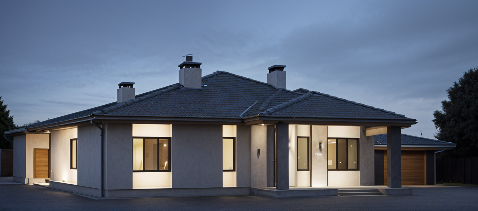 modernist exterior shot night view add backlighting to the facade light fixtures architecture