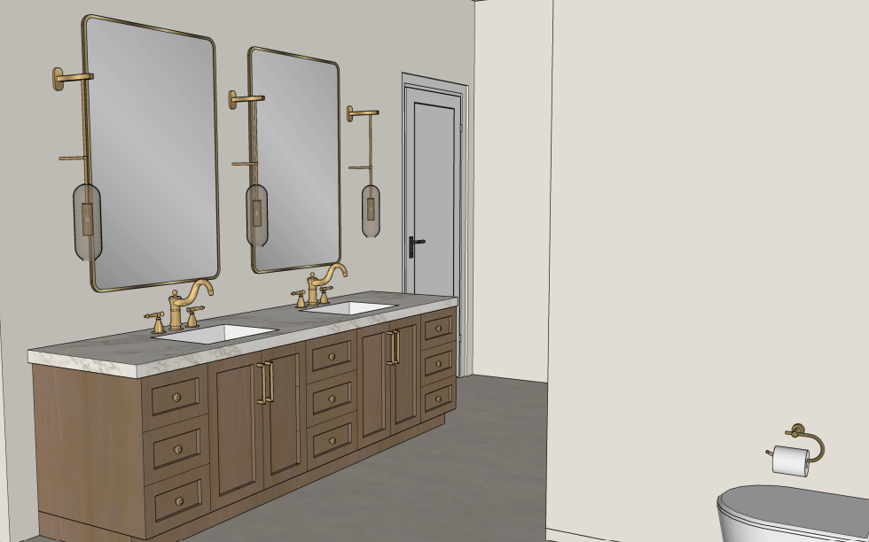 render this bathroom as a photorealistic interior do not change any colors materials finishes proportions or design elements keep the warm medium wood vanity exactly as shown the brass faucets and hardware the white undermount sinks the marble countertop with soft grey veining the warm neutral wall color the grey floor and the brass framed mirrors with matching wall sconces maintain the exact layout geometry spacing and camera angle add soft even ambient lighting with subtle directional light from above to enhance realism add lighting to the wall sconces