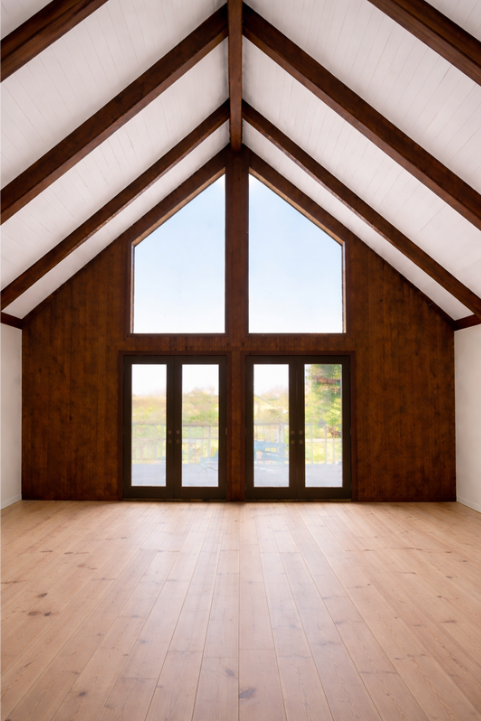 lighten the stain of the wood beams and wood walls keep the flooring the same do not change the structure or layout remove the wood trim between the wall and slanted ceiling keep the wooden beams as is