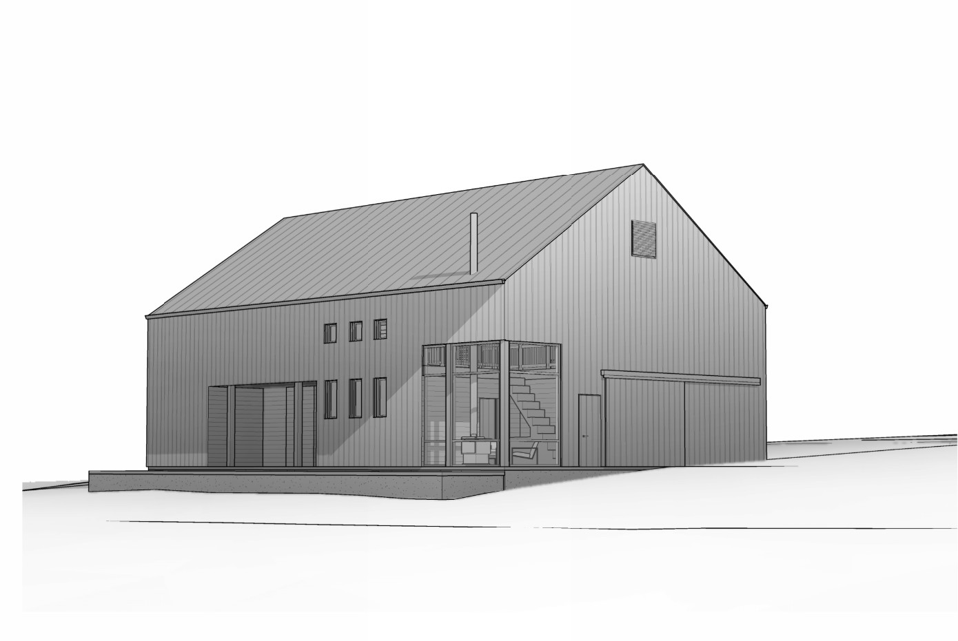 in rural setting siding roof and doors to be ribbed galvanized metal posts to be wood interior of barn to be wood inset porch area to be wood clad