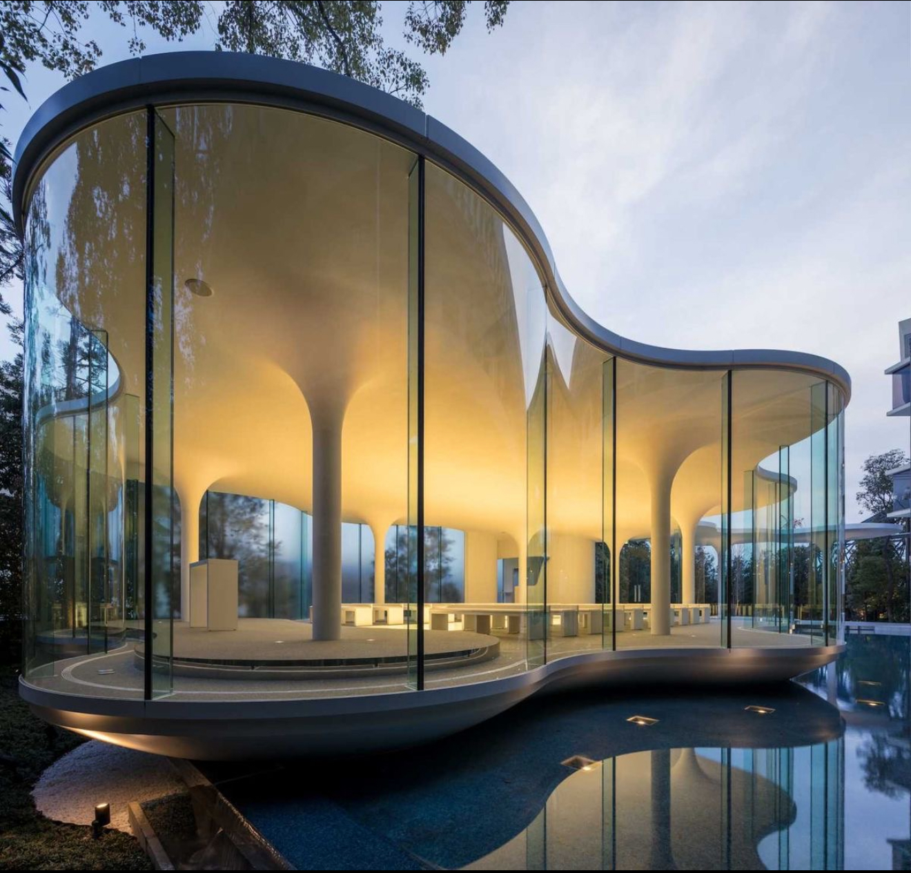 zaha hadid exterior shot ice cream and dessert store in this building and neon lights in windows architecture