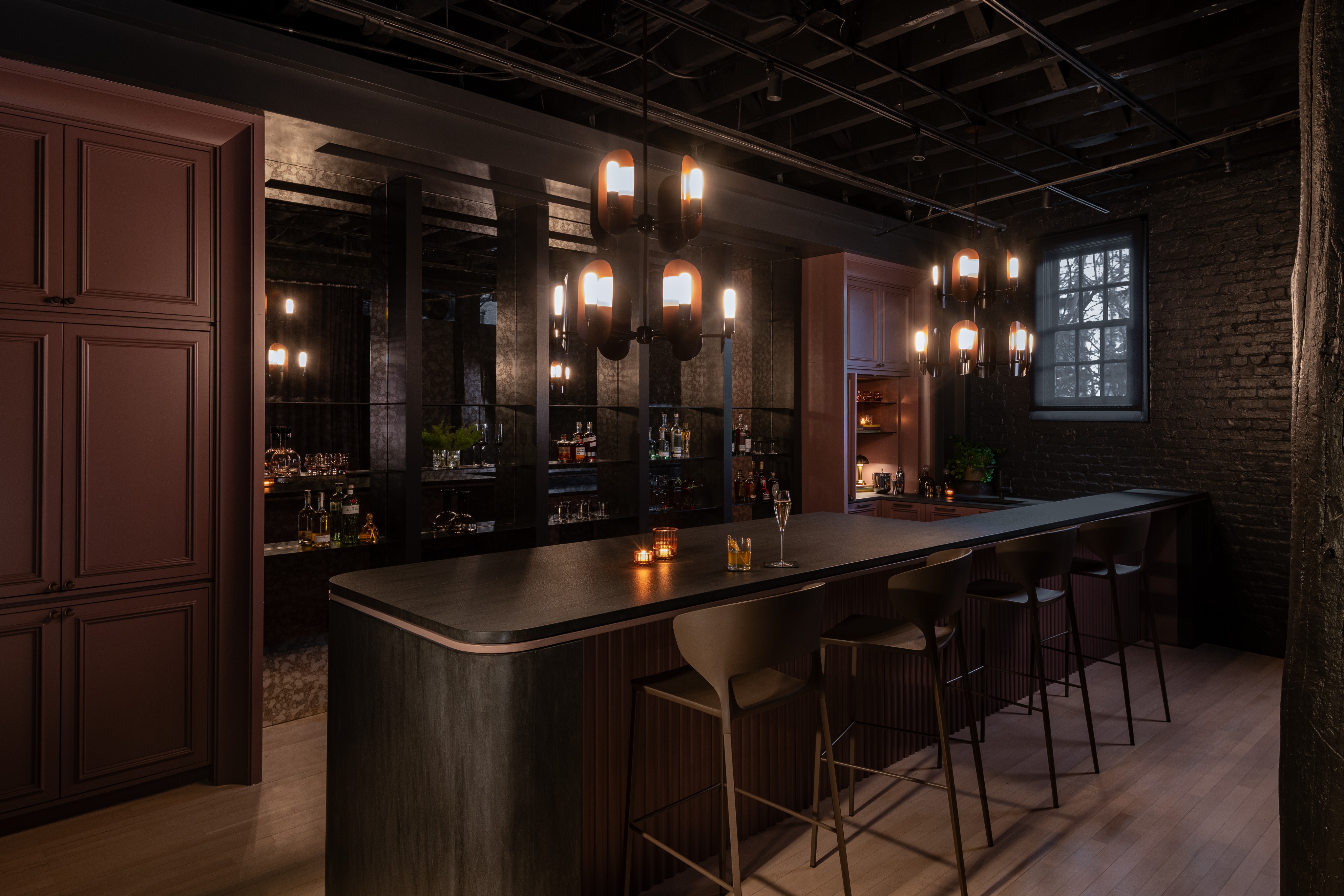 dim the light bulbs by 75 dampen any reflective surfaces show moody sunlight coming through the window casting a tight shadow pattern on the countertop dont change anything structural in the photo