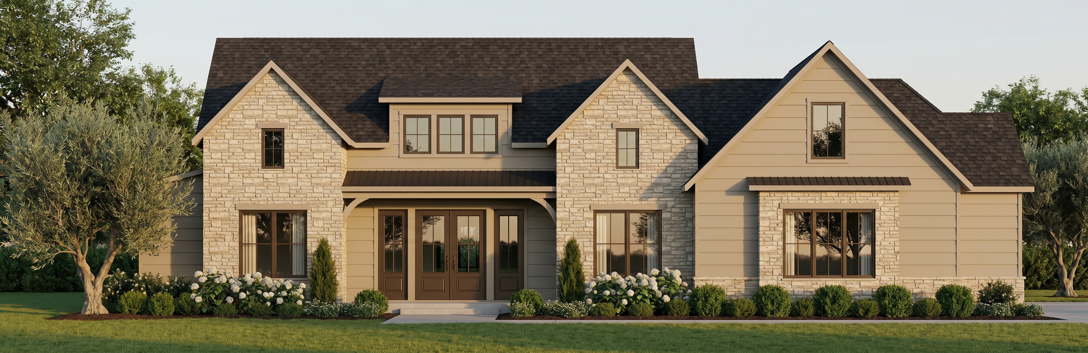make the olive tree smaller make the stone slightly darker doors plus faux doors at front porch should be full glass iron thin frames small arched pieces at front porch make medium dark wood