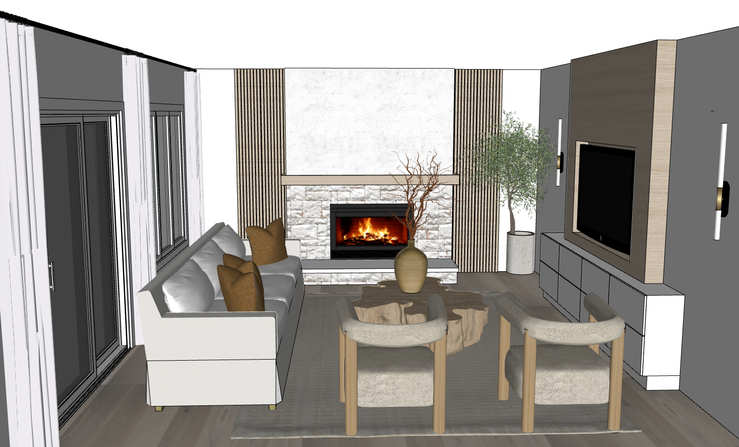 the walls and ceiling are white the doors to the left is clear glass with white doors th wall over the stone on fireplace is a white plaster look put an exterior scenary where doors are floors are light white oak put light coming out of the sconce