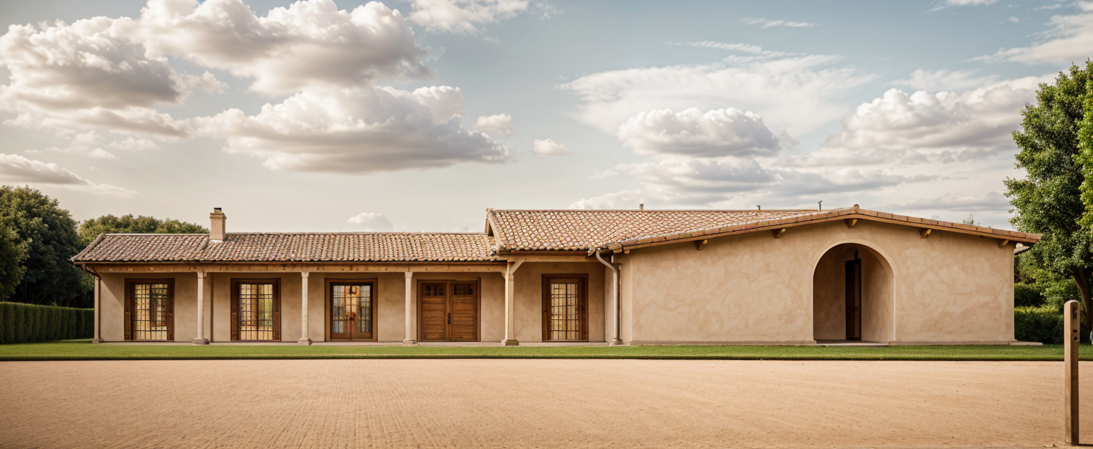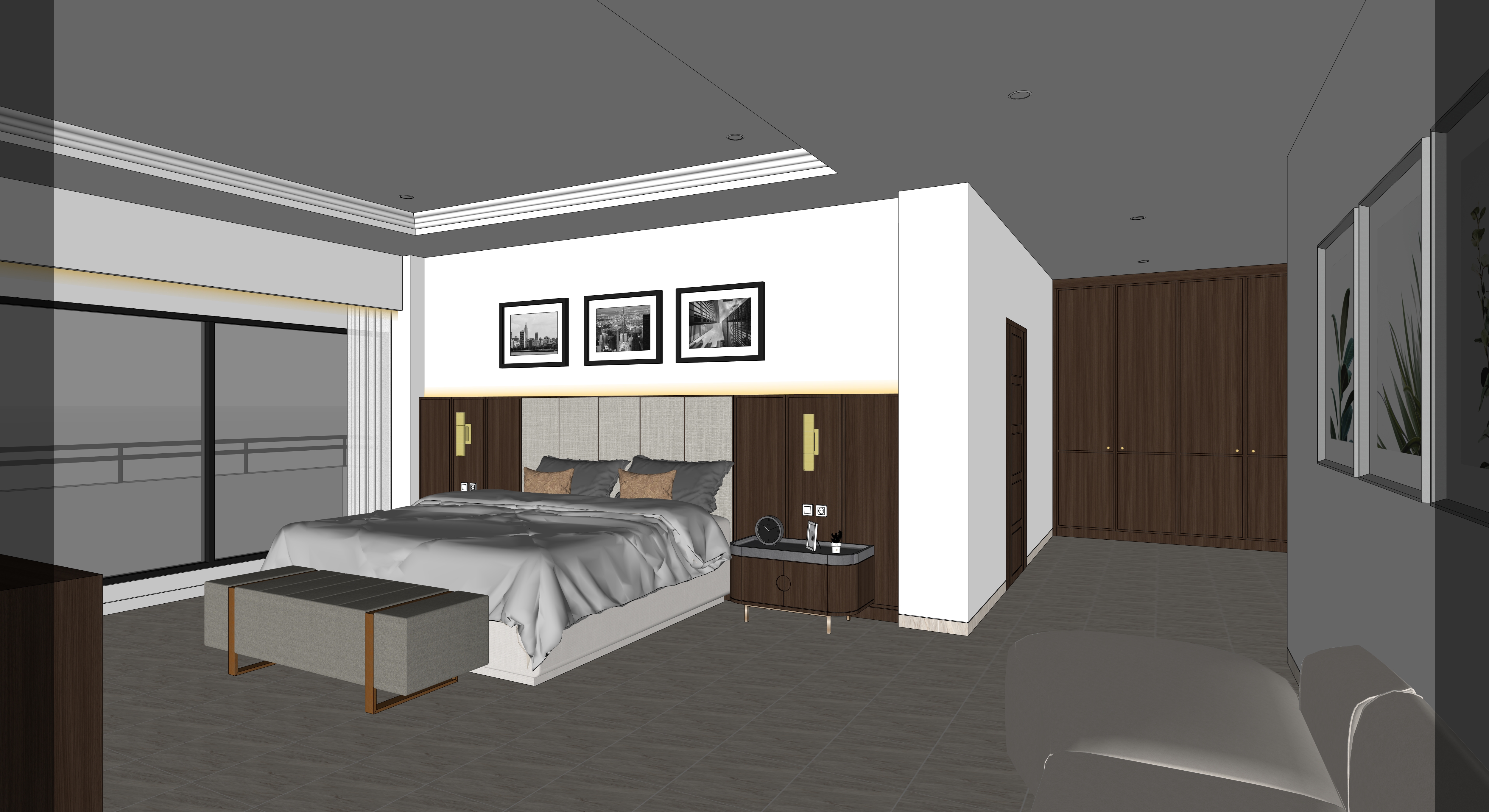 render a modern bedroom with an elegant and calming atmosphere use soft neutral tones and warm lighting the walls should be painted in a soft white with white ceiling incorporate a sleek dark wooden cabinet with a large flat screen tv mounted above it the floor should feature a cream marble tiles complementing the minimalist design add sheer white curtains around large black framed windows the bed should have gray bedding with plush back pillows and the side tables should be dark wood with modern lamps use subtle golden accents for a touch of luxury ensure the space feels spacious and serene exuding a cozy and inviting ambiance the wardrobe should be dark wood with golden round handle the balcony outside the windows with 80cm heigth white wall with black pipe railing above it