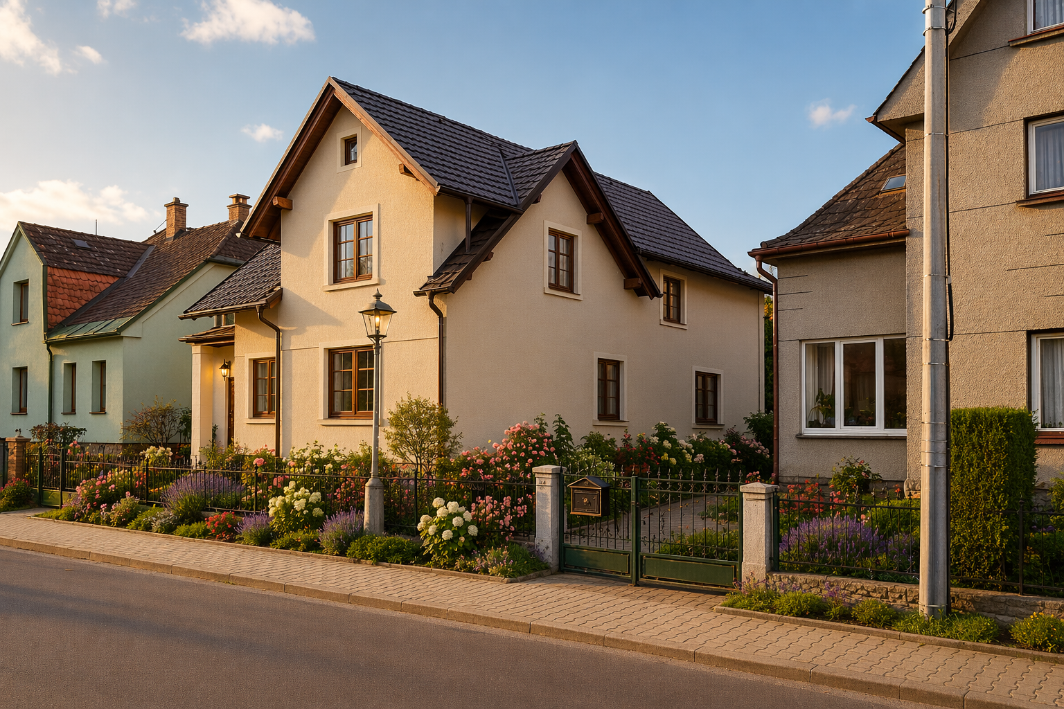you are an architect and facade designer you are given a visualisation photo of an existing house and your task is to redesign the facade in a realistic and tasteful way keep the overall shape of the house the roof and the exact placement and size of all existing windows unchanged do not remove add resize or move any windows do not alter the roof shape roof pitch dormers gables or overall building massing the house must remain recognisable and believable create an ultra realistic exterior visualisation of the house from the same or very similar viewpoint with warm natural daylight or golden hour lighting realistic shadows photorealistic materials and a believable residential setting the style should be appropriate for a house in the czech lands czechoslovakia around the year 1920 with a subtle german influence the facade should reflect the architectural language of that period modest carefully proportioned and crafted with restraint the house should feel regionally appropriate and historically believable not modern not theatrical and not overloaded with decoration the previous design attempts felt too busy and overdecorated avoid that the facade should be simpler calmer and more coherent the main problem is that the side elevation contains asymmetrically placed windows and the facade should make this feel natural without trying to force symmetry in particular avoid creating the impression that a window is missing avoid any meaningless vertical or horizontal lines fake frames or decorative panels that suggest an invisible window or make the composition look awkward do not try to solve the asymmetry by covering the wall with too many frames mouldings or decorative lines the side wall should not look cluttered or overdesigned instead use a restrained and architecturally convincing composition keep the design simple and elegant you may use only a few well chosen facade elements for example a simple well proportioned stone or rendered plinth base one horizontal band or string course separating the ground floor and upper floor subtle corner articulation or simple pilaster like strips if they make sense restrained trim around windows a slightly different texture or tone between plinth and upper facade one or two simple framed wall fields or shallow recesses only if they help the composition a quiet balanced treatment of the larger blank wall areas a modest period appropriate facade with careful proportions rather than many decorative details pay special attention to the lower part of the side wall where the large empty area may feel as if a window is missing do not add a fake window or use decorative lines suggesting one instead make the wall feel intentional through simple and restrained facade composition make sure the area around the upper windows especially near the gable and upper floor is handled simply and logically avoid awkward vertical lines or framing that appears random or that makes the window arrangement look stranger the design should feel modest but thoughtful with a sense of detail and proportion typical of domestic architecture from around 1920 in the czech lands with a subtle german character the final house should have more soul and visual coherence but it should remain calm and not overloaded if there are flowers or plants covering the bottom part of the house reduce them where necessary so that the plinth base is visible and the facade design can be clearly read the landscaping should remain simple and believable materials must look photorealistic and true to life slightly textured render realistic stone or rendered base natural window frames realistic paving believable fencing proper shadows subtle imperfections and physically accurate lighting the final image should look like a real high quality architectural visualisation or a photograph of a thoughtfully designed or renovated house with a restrained and coherent facade the asymmetrical windows should no longer feel accidental or unresolved but rather naturally integrated into a simple well composed facade avoid clutter and avoid overdecoration