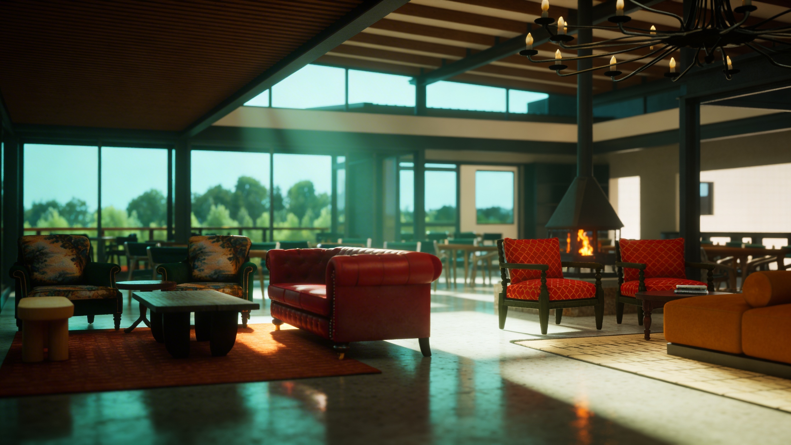 create a photo realistic render of the scene make the hood vent over the island and stools chrome finish daylight comes from the glass beside the fridge and from behind the blue framed glass doors on the right side of the image lights are to be shining down from the hood vent add clusters of pots and pans on the red metal shelves above the hood vent and also hang some below the counter tops are a white marble and the faucets are a chrome the ceiling is exposed so there is mechanical and electrical visible