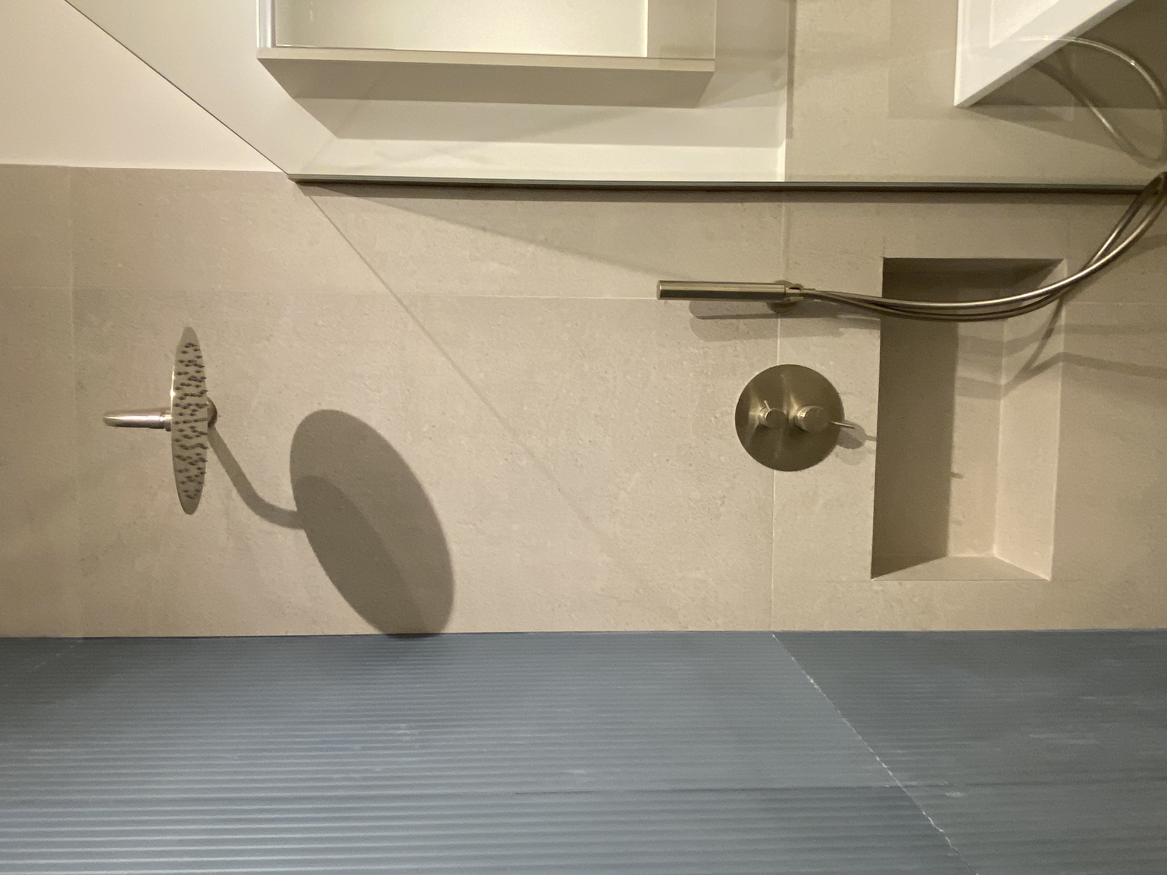 enhance this image in a professional real estate photography style while strictly preserving the original lighting fixtures and scene do not add generate replace or modify any lighting fixtures lamps or light sources keep all lighting exactly as in the original image with the same direction intensity and color temperature improve overall image quality by increasing sharpness clarity and resolution remove pixelation and compression artifacts while maintaining natural textures apply subtle noise reduction and detail enhancement without creating an artificial or overprocessed look correct lens distortion and straighten vertical lines balance exposure gently without flattening contrast enhance the blue tiles so they appear clean even and well finished remove any visible imperfections uneven tones or dullness while preserving the exact material color texture and pattern do not redesign or replace the tiles only refine their appearance to look high quality and well maintained remove reflections and glare from the shower glass and metal fixtures the glass should appear clean clear and natural without harsh light reflections or visual distractions keep all materials realistic avoid overly smooth plastic or cgi like surfaces do not change colors objects layout or lighting setup in any way only enhance the existing photograph