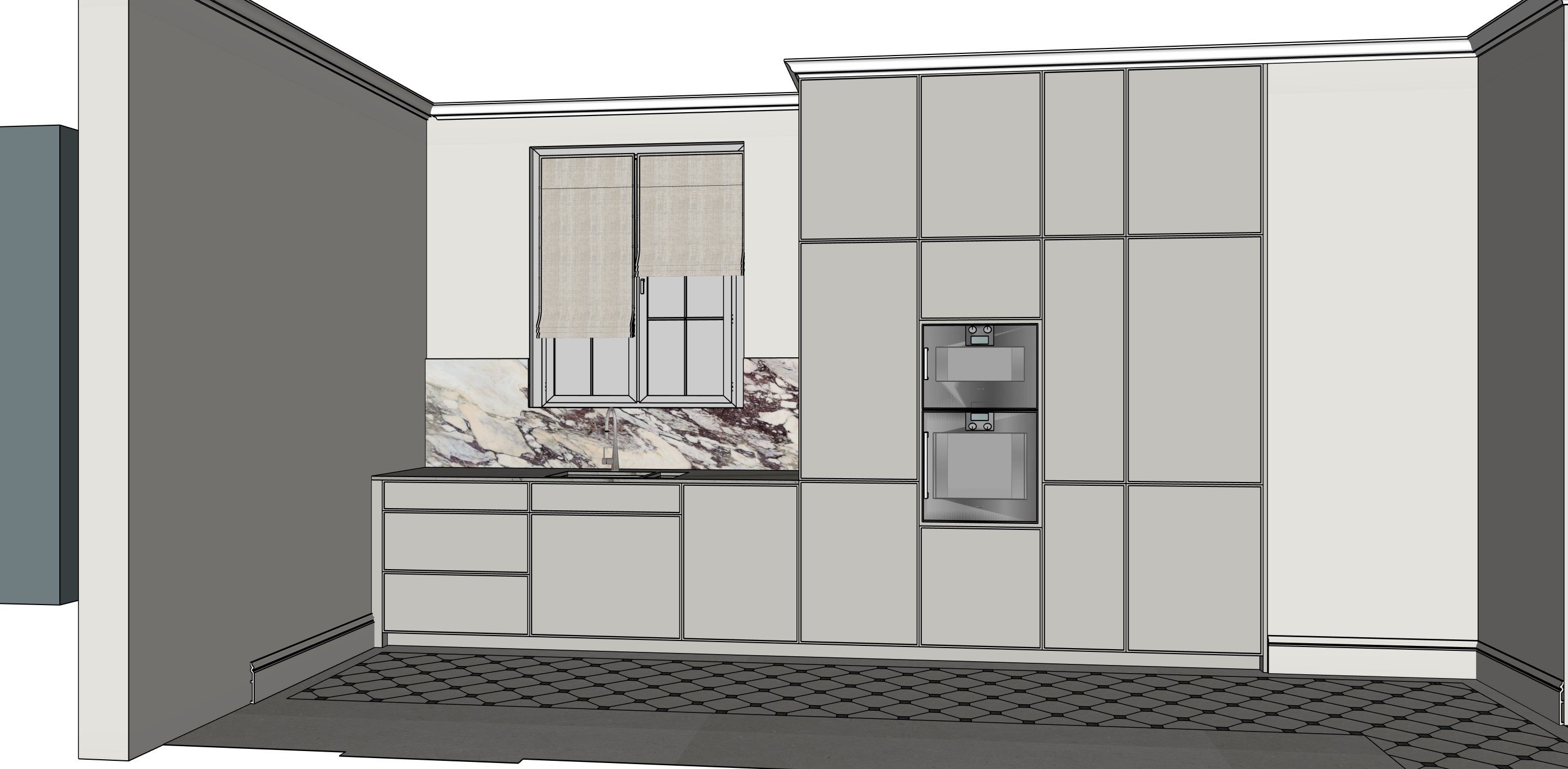 the apartment is on the 3rd floor of a parisian building the walls are in light greige the stone is calacatta viola like this one https www italgranitigroup com fr collections italstone italstone calacatta viola the cabinets are in ressource peinture le frisson like this https ressource peintures com produits peintures les collections ressource le frisson flocon tremblotant r033 the floor is in black and light beige cabochon tiles like these https www ligerio fr p dallage a cabochons en pierre du nivernais attribute pa epaisseur 1 5 cm attribute pa finition finition brossee attribute pa dimensions 30 cm x 30 cm gad source 1 gad campaignid 22580861264 gbraid 0aaaaacovxwoqoy2u daf1vivokbpblzvq gclid cjwkcajwwjzpbhbreiwajfhrntcp0bnzlynykaejdbbbwtwgj mcma0bvnsgm0xike6zgrx9gzfjirocdzqqavd bwe the look and feel should be a little more moody and textured