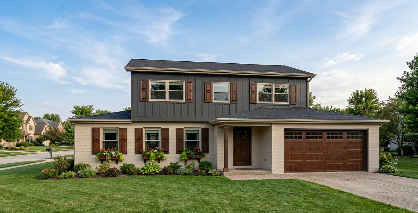 black asphault roof cream paint asphault driveway to both garage doors patio walkway to front porch noon time sun in the woods