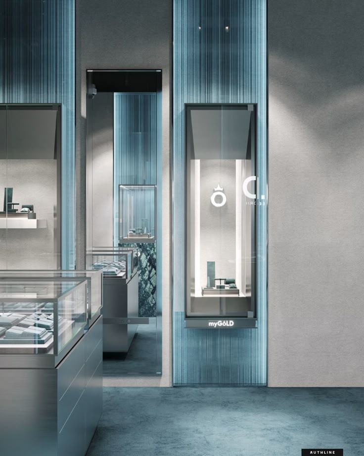 interior shot render a luxurious jewellery store interior inspired by the reference image use the exact same colors materials and finishes as in the reference including the flooring wall treatments shelving design and lighting style maintain the same modern elegant atmosphere add finely detailed jewellery pieces arranged inside the display shelves and counters necklaces rings earrings and bracelets placed on velvet holders and glass cases ensure the jewellery sparkles subtly under the lighting enhancing the sense of luxury keep the space refined minimal and premium with realistic textures and high quality details