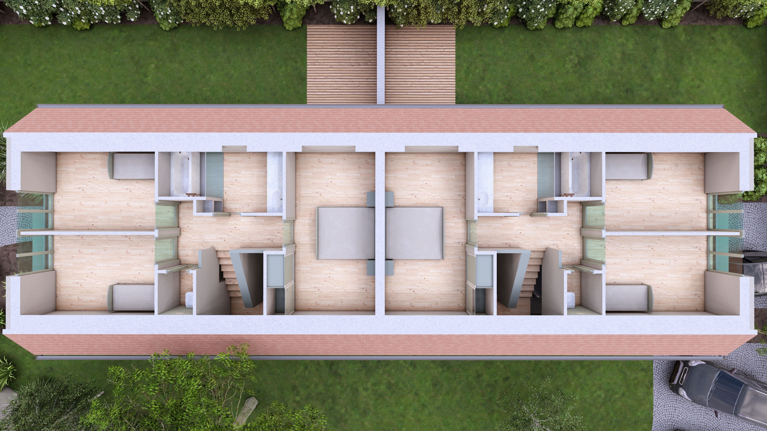 decorate the interior give the interior japandi style add lights to the interior use wooden floor in the bathroom and toilet use ceramic floor in the outdoor change the grass and plants to something more realistic