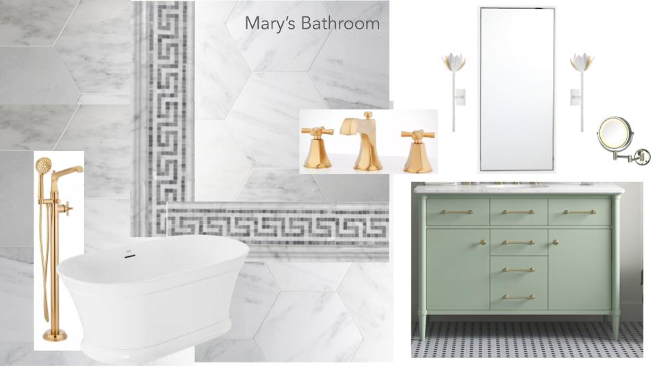 8 x 14 bathroom with two vanities window and tub between vanities use all white tulip sconces greek key tile border for floor only