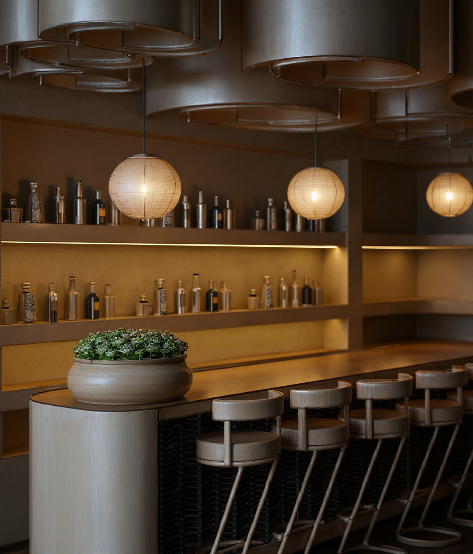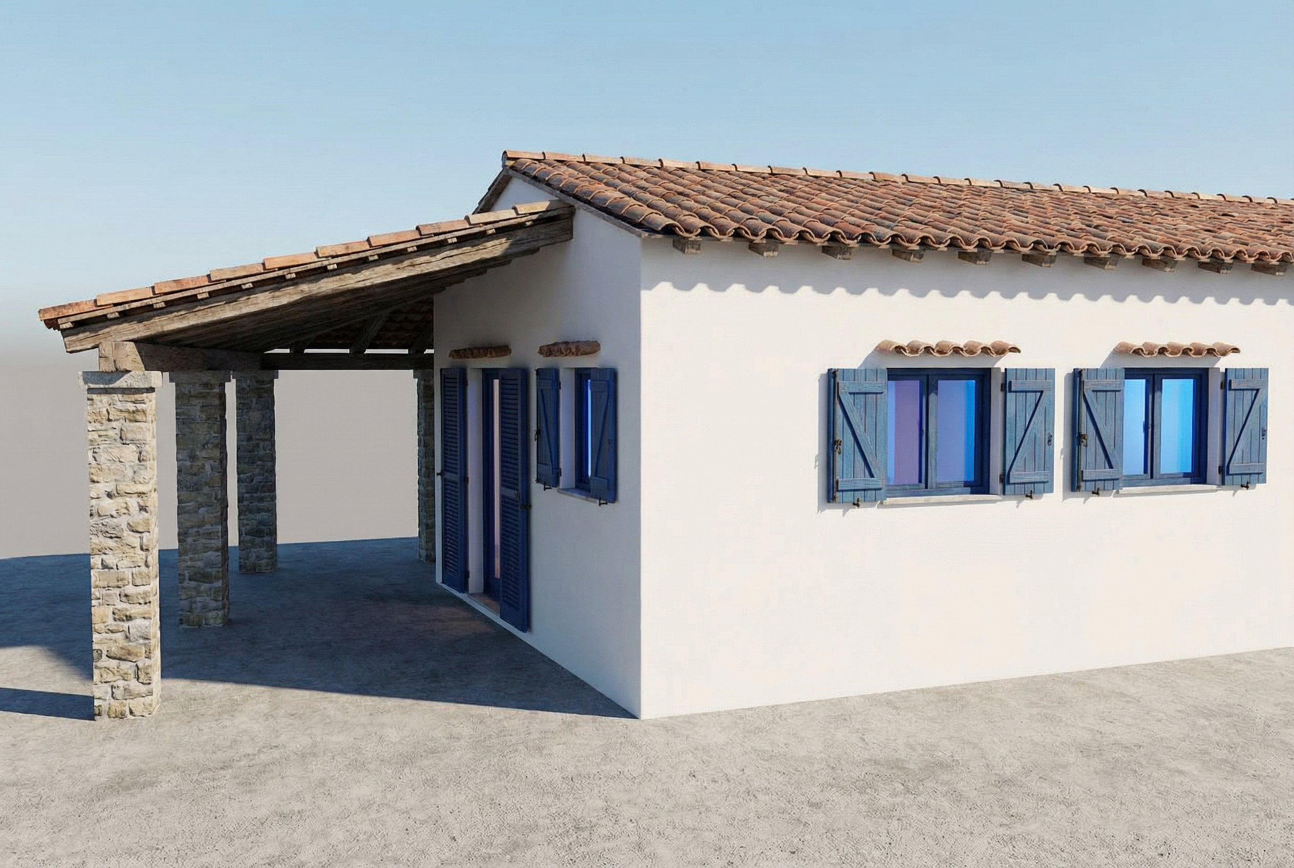 keep the same camera angle proportions and layout do not change or move any elements paint the sofa in green color natural soft green tone change the chairs mix green beige and light brown tones for a natural variety make the tables wooden with black marble pattern tops on the right wall add a flat tv and a few decorations such as pictures plants and small art pieces improve the lighting to make it brighter and warmer more realistic give the whole space a slightly more modern and elegant mediterranean look do not change the framing dimensions or furniture placement