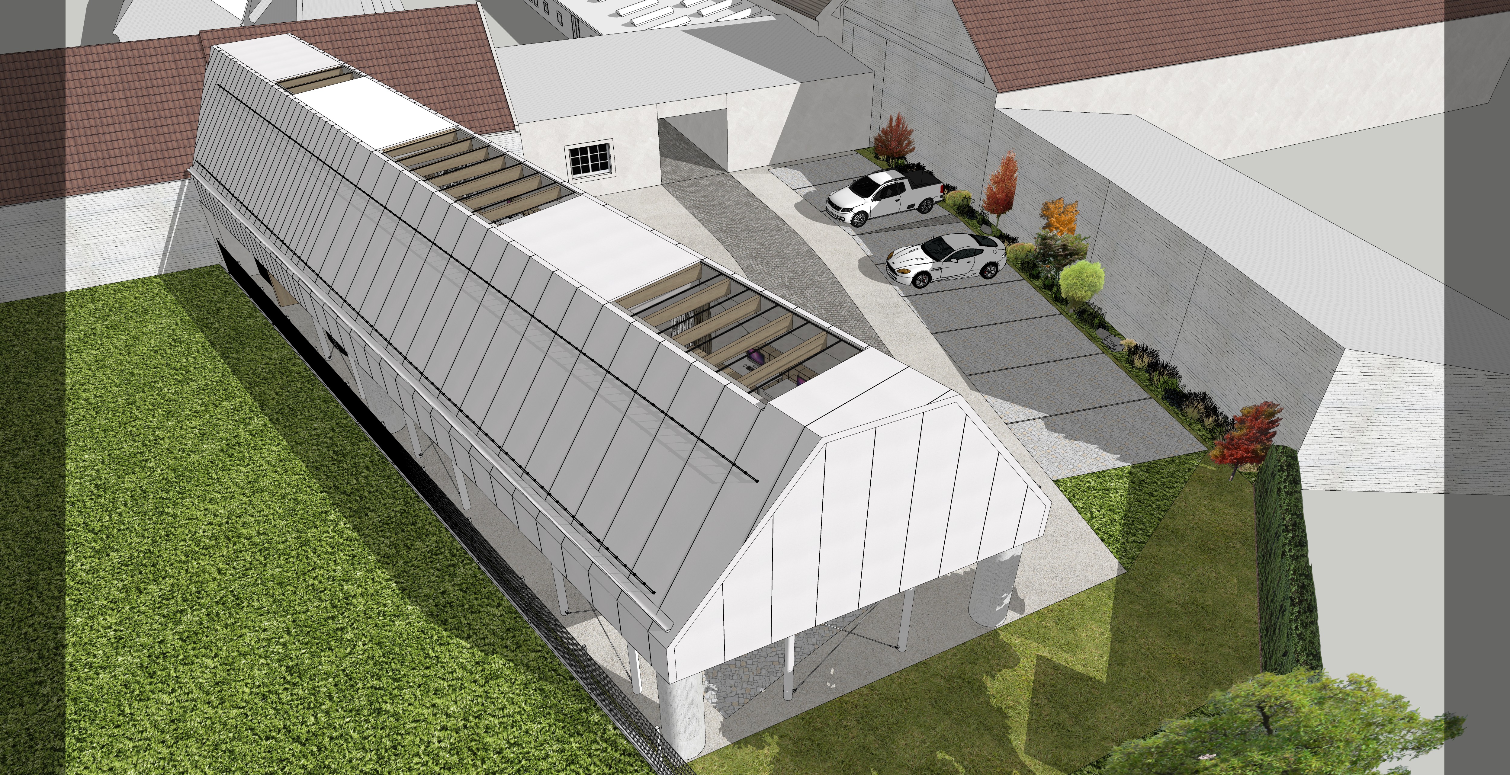photorealistic visualization roof material gray sheet metal columns concrete greenery real grass winter lights and clouds walking area interlocking paving stones granite grey