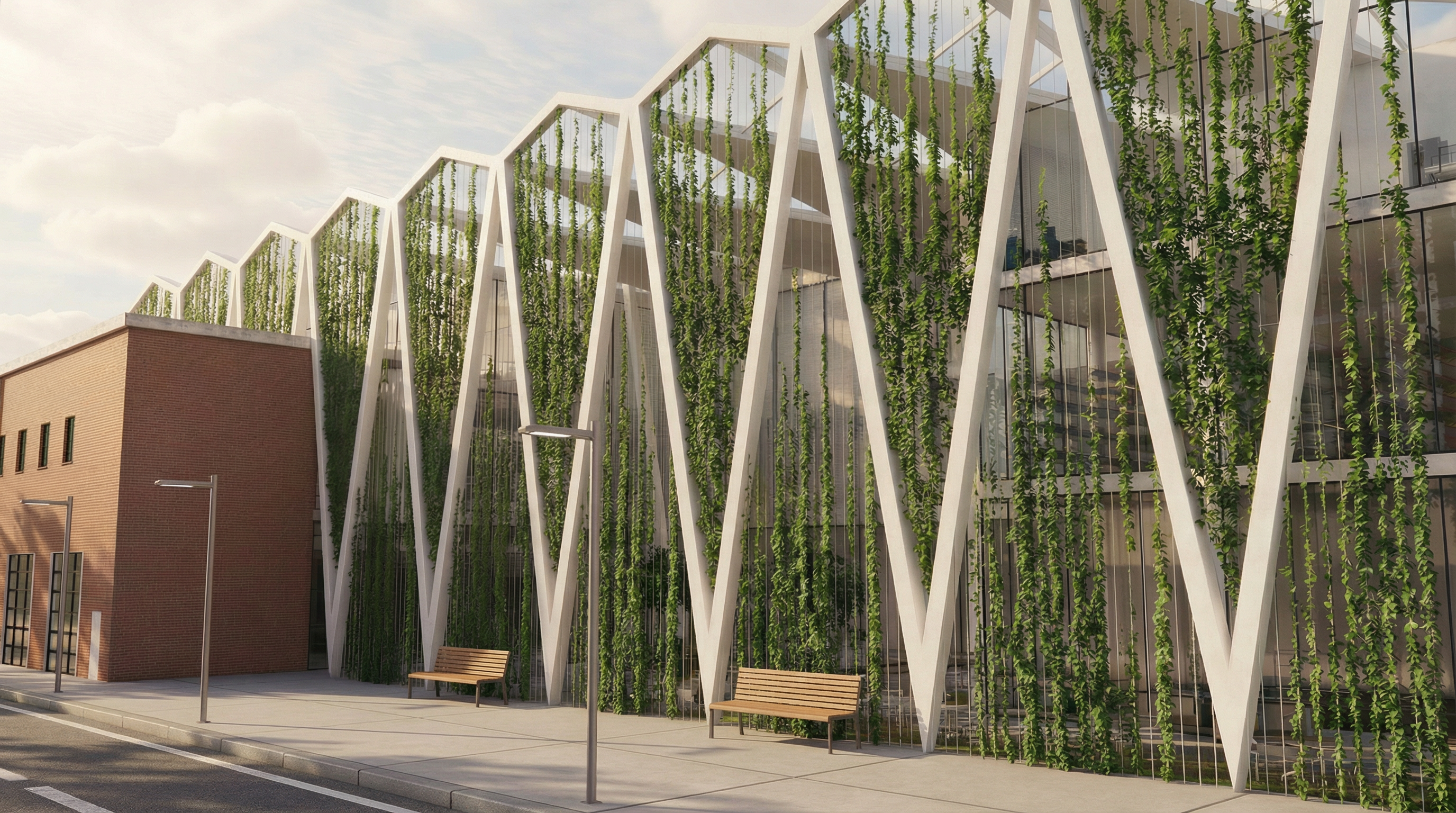 do not modify the building fa ade v columns greenery or camera angle restore the three modern streetlights along the curb line slim poles evenly spaced near the road replace the current seating blocks with very small minimalist perches no longer than 3 4 feet and no deeper than 1 foot they should be slim low profile concrete or metal seating elements simple rectangular perches that read as subtle urban furniture not benches center them within their bays keep everything else the same