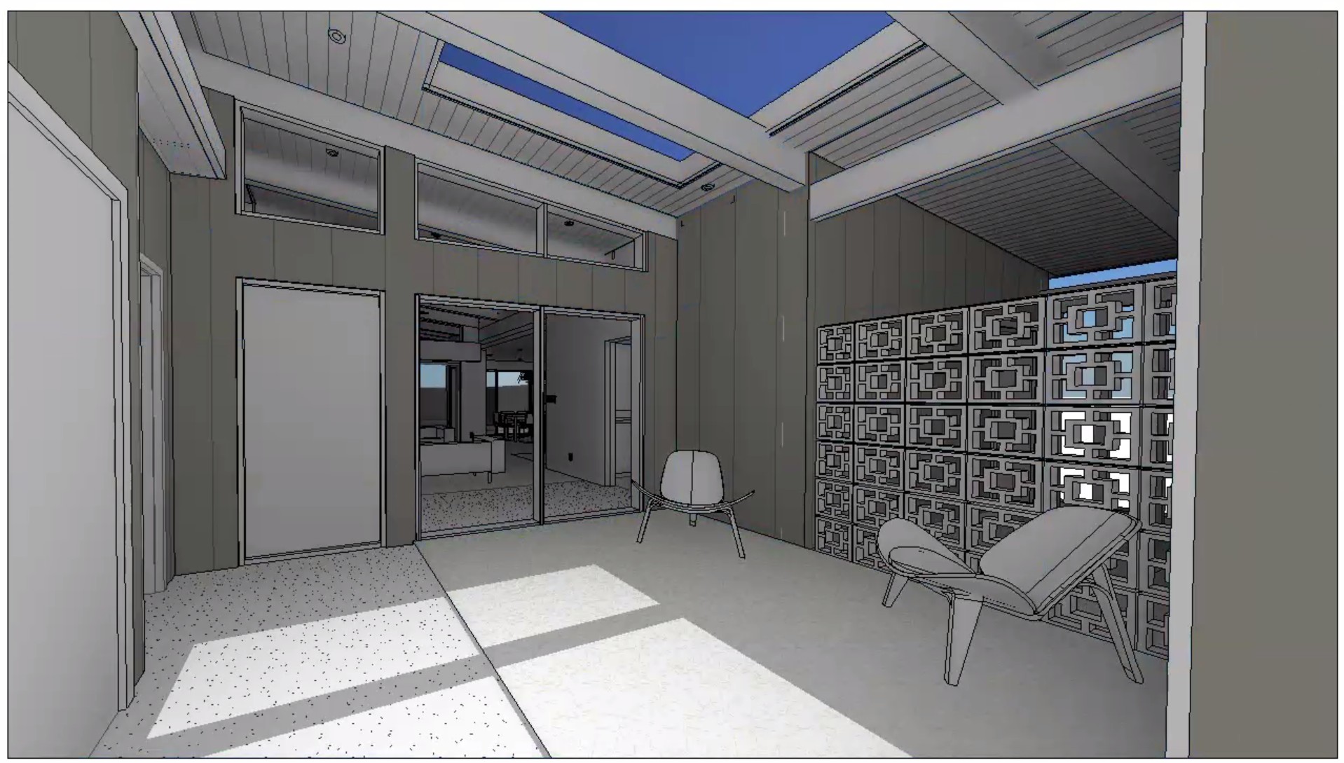 a relaxing japandi inspired modern exterior entry courtyard with a spa like outdoor lounge area in a mid century eichler designed suburban home with t g ceilings and exposed beams set in arizona with a breezeblock wall separating the courtyard from a carport out of view to the right of frame the main living area of the house is visible behind large windows in the mid range background with the backyard visible behind another wall of windows in the far background the lounge area is landscaped with permeable hardscape and includes a few boulders and agave