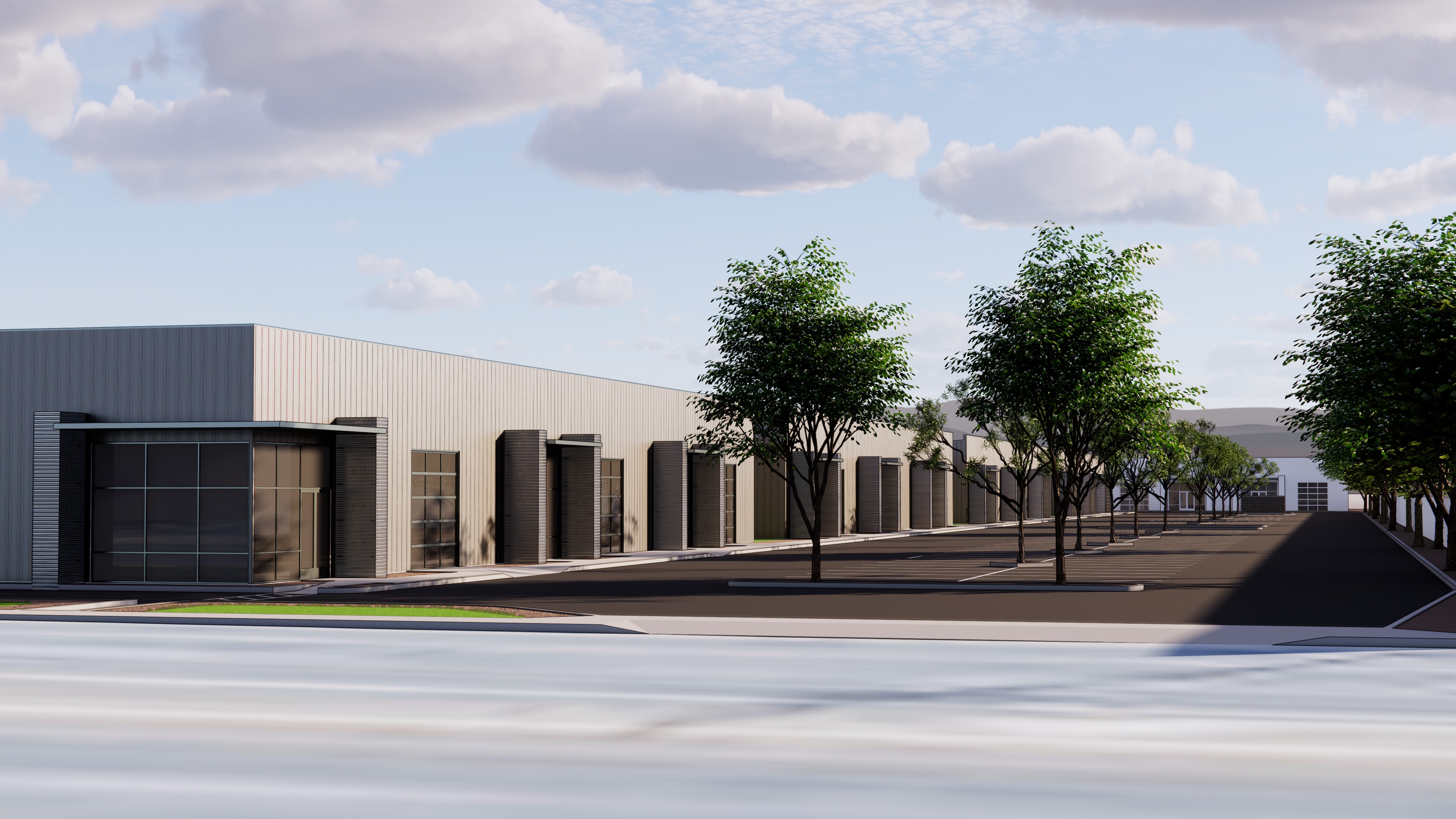 new commercial site containing 5 metal corrugated metal buildings parking lot trees and trash enclosure