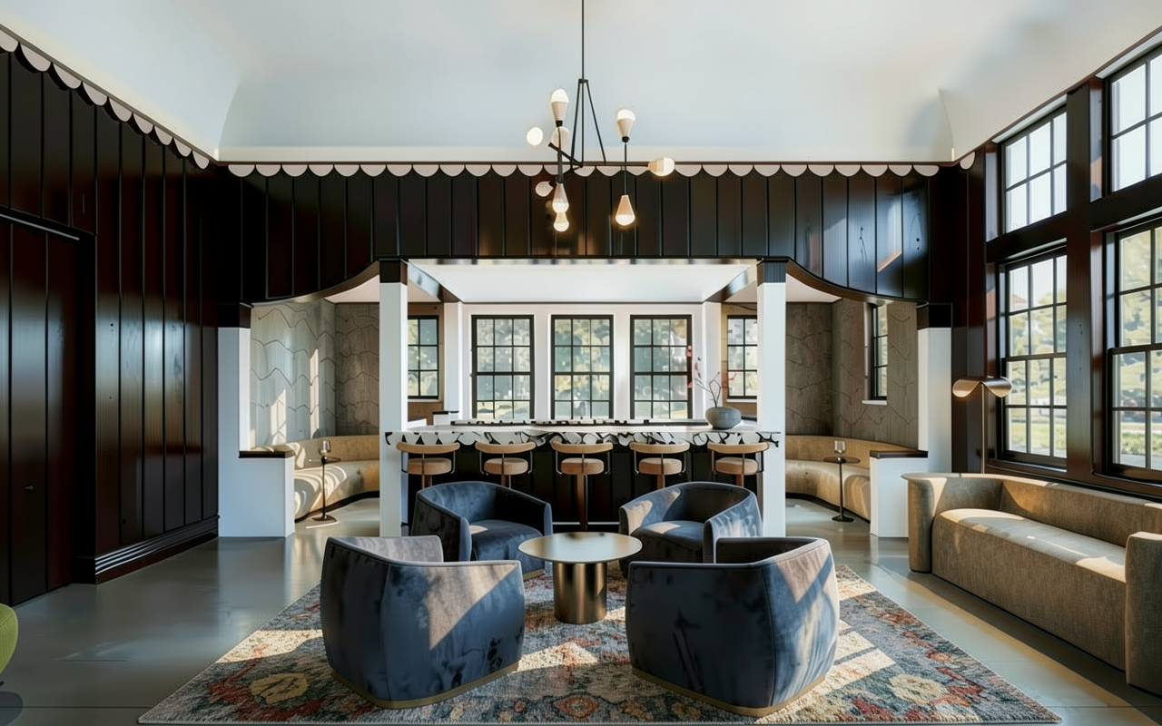 render elevation with off white painted wood siding with 6 inch exposure off white standard shutters sand tone aluminum windows dark charcoal roof show dark bronze metal roofing on side facing porch with off white wood trim show a row of box wood bushes in front and driveway along front