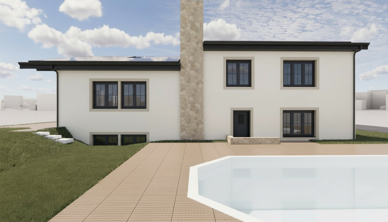 lot of lights reflect in the windows some hortensia and pampa are planted in the garden an olive tree as well on the left side the swimming pool is full of water