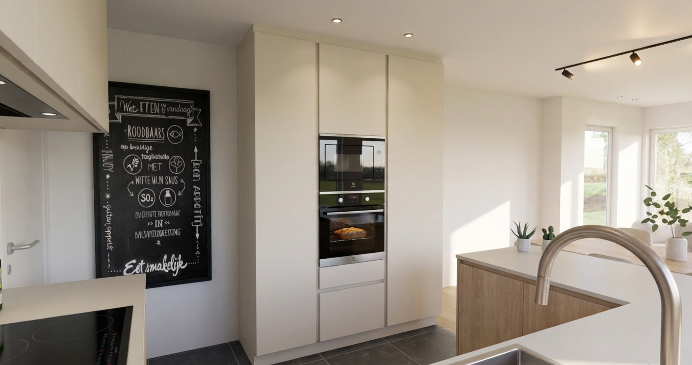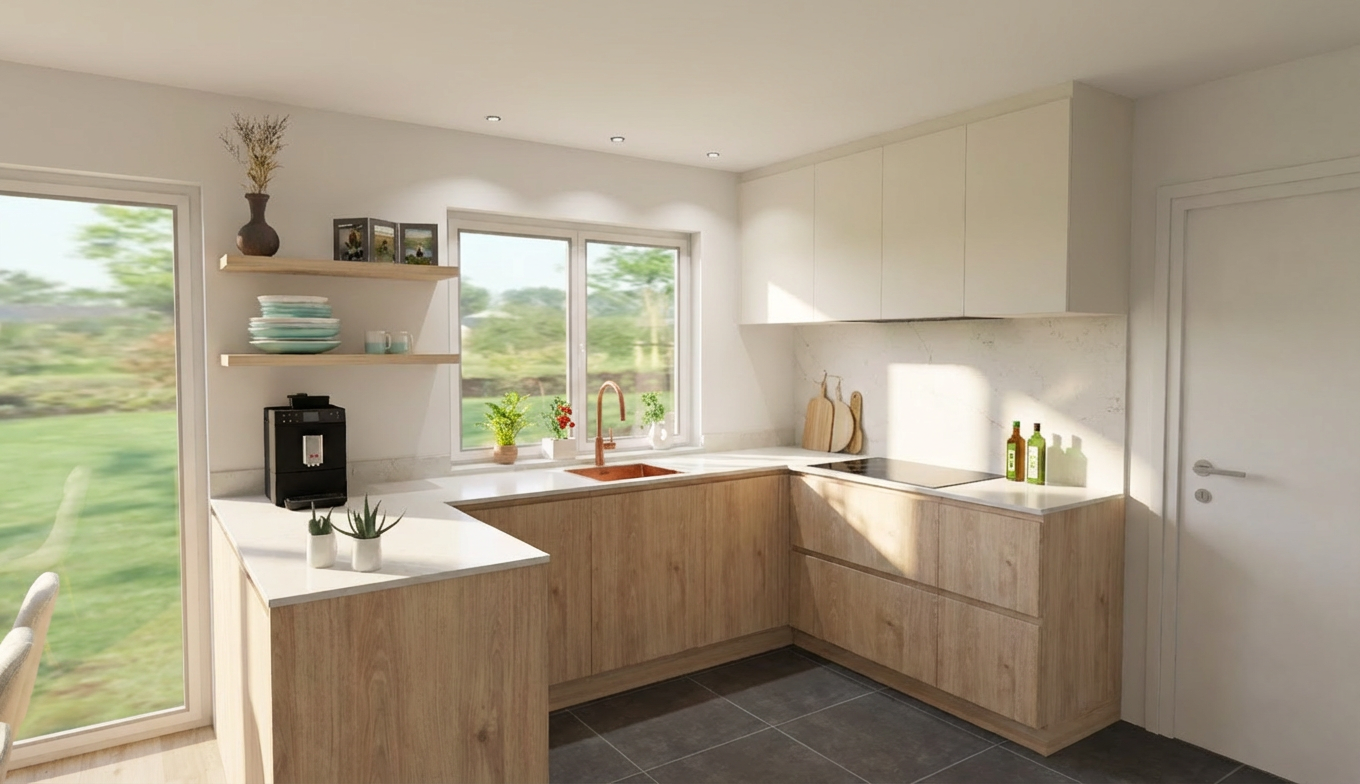 convert this architectural rendering into a highly realistic editorial style luxury real estatephotograph suitable for marketing and listing imagery maintain the exact architecture layout geometry cabinetry layout window placement andproportions exactly as modeled do not redesign restyle or modify the architecture or cabinetry do not move or adjust cabinets appliances islands windows or walls enhance realism only through natural lighting accurate material texture subtle reflections andsoft shadow depth the image should feel like a professionally photographed architecturaldigest style interior used for luxury real estate marketing materials in the space include builddirect engineered wide plank flooring in seashore finish walls and ceiling painted origami white by sherwin williams cabinetry featuring a natural stained woodcabinets countertops and backsplash in silver root honed quartzite with soft slightly warm tonesthe wood flooring should show authentic grain correct plank scale subtle tonal variation and anatural matte sheen the natural stained wood cabinetry should show realistic wood grain depth natural variation and refined craftsmanship white cabinetry should appear clean crisp and softly illuminated with natural shadow lines atthe doors and panel details the silver root honed quartzite counters and backsplash should appear natural and refined with softmovement and subtle warm tonal variation not overly glossy or artificial natural light should be softly entering through the windows in an editorial architecturalphotography style creating gentle highlights natural interior bounce light and subtle shadowdepth throughout the space the furniture and decor shown in the rendering should be treated as placeholders and replacedwith high end restoration hardware and pottery barn style staging elements appropriatefor a luxury kitchen inside the glass upper cabinets add very minimal restoration hardware style styling only afew carefully placed objects should be visible such as a small stack of neutral ceramic plates a few simple glassware pieces one refined serving objectthe glass cabinets should remain mostly open and uncluttered maintaining a clean high endappearance add subtle kitchen staging elements such as a neutral stone or ceramic bowl a refined serving tray or board a small stack of curated cookbooksall staging should remain restrained and minimal so the architecture and cabinetry remain thefocus the final image should appear highly realistic refined and editorial similar to a luxuryarchitectural digest feature or professionally photographed high end listing do not alter architecture cabinetry layout appliances materials geometry or design onlyenhance realism and staging