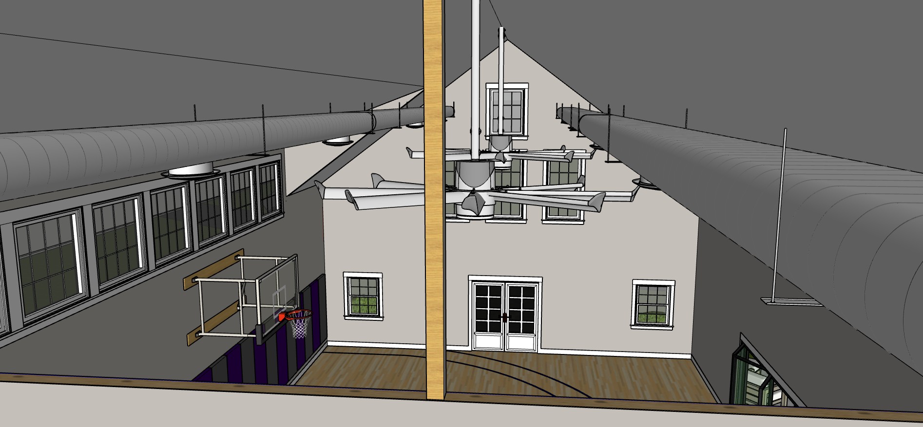 view is an interior shot from the balcony above looking down to the basket ball court below maintain colors and make realistic