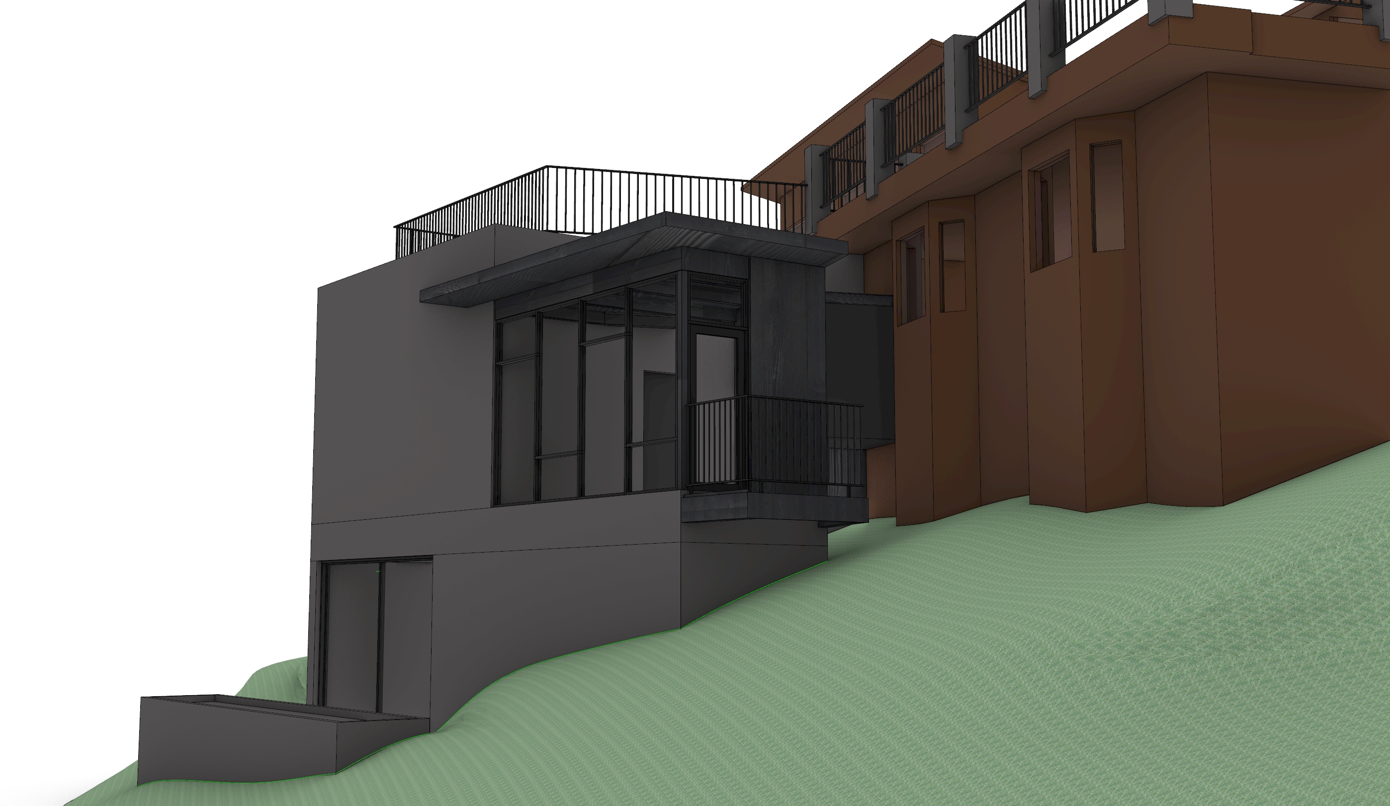 house is located in los angeles hills the house has black cement stucco with tinted black concrete walls and planter below the existing house has brown vertical siding there s also black metal railings the wood around the windows is exposed with black stain
