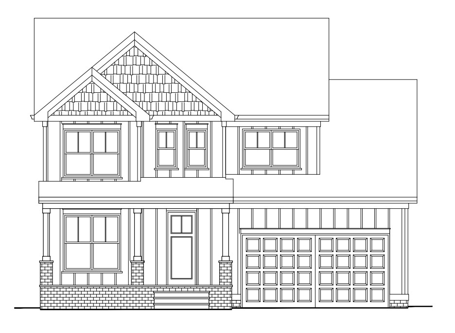 exterior shot garage door is white siding is gentek brand in hero blue color shakes are foundry brand in rustic slate color brick is a dark gray