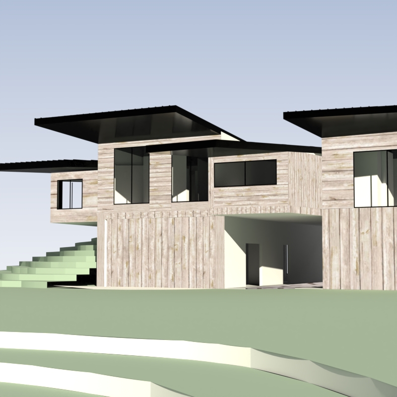 add trees in front and back of building to make it look like the building is in between a forest make the render look like watercolor where the borders start to fade out into white have the black roofs look like black corrugated metal panels have the exterior walls be white oak horizontal planks the sky is light blue with fluffy clouds