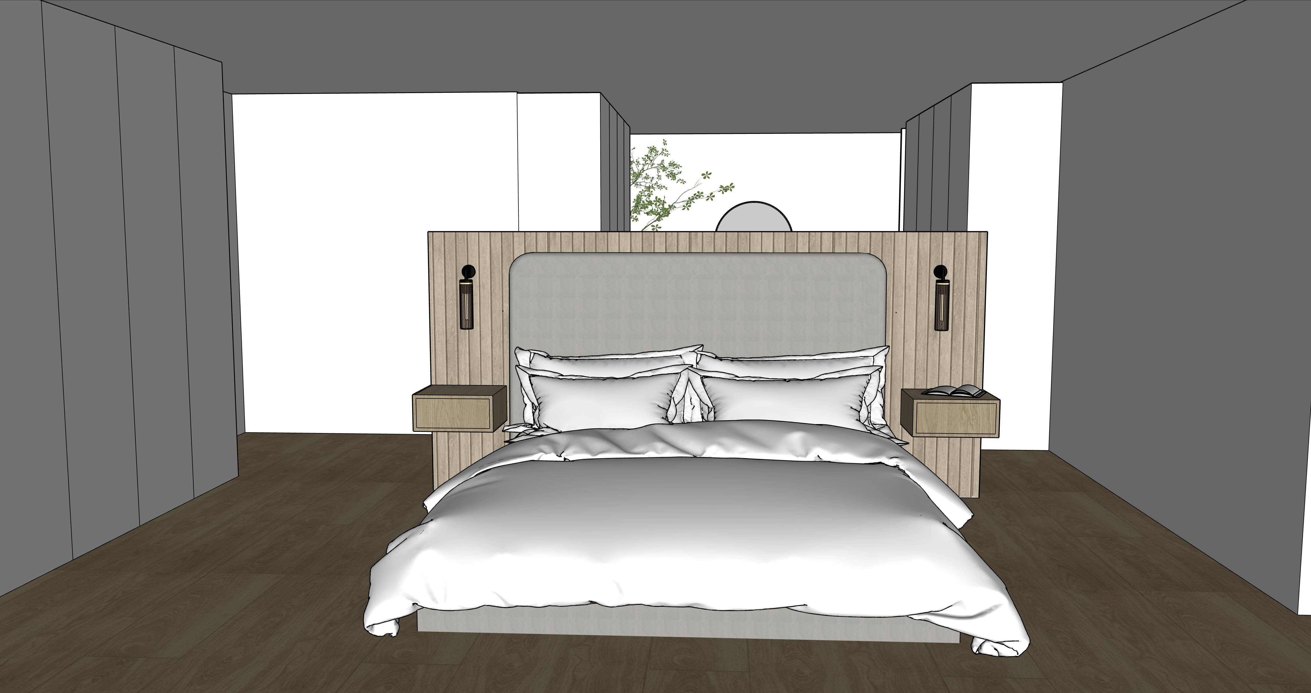 paredes y techos blancos headboard de la cama en color mas natural mejorar iluminaci n con sombras no hay ventana atr s solo una maceta con planta el suelo en madera clara y del lado izquierdo es un armario con puertas lacadas en blanco
