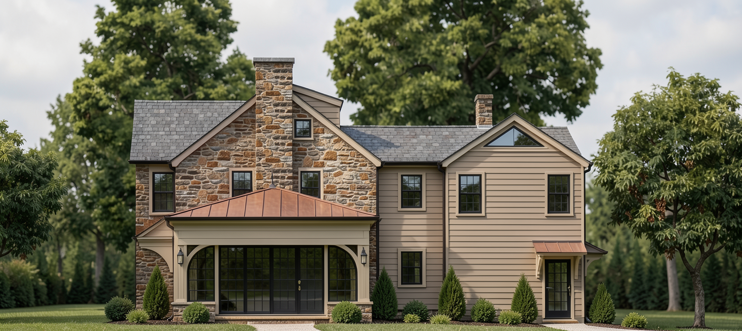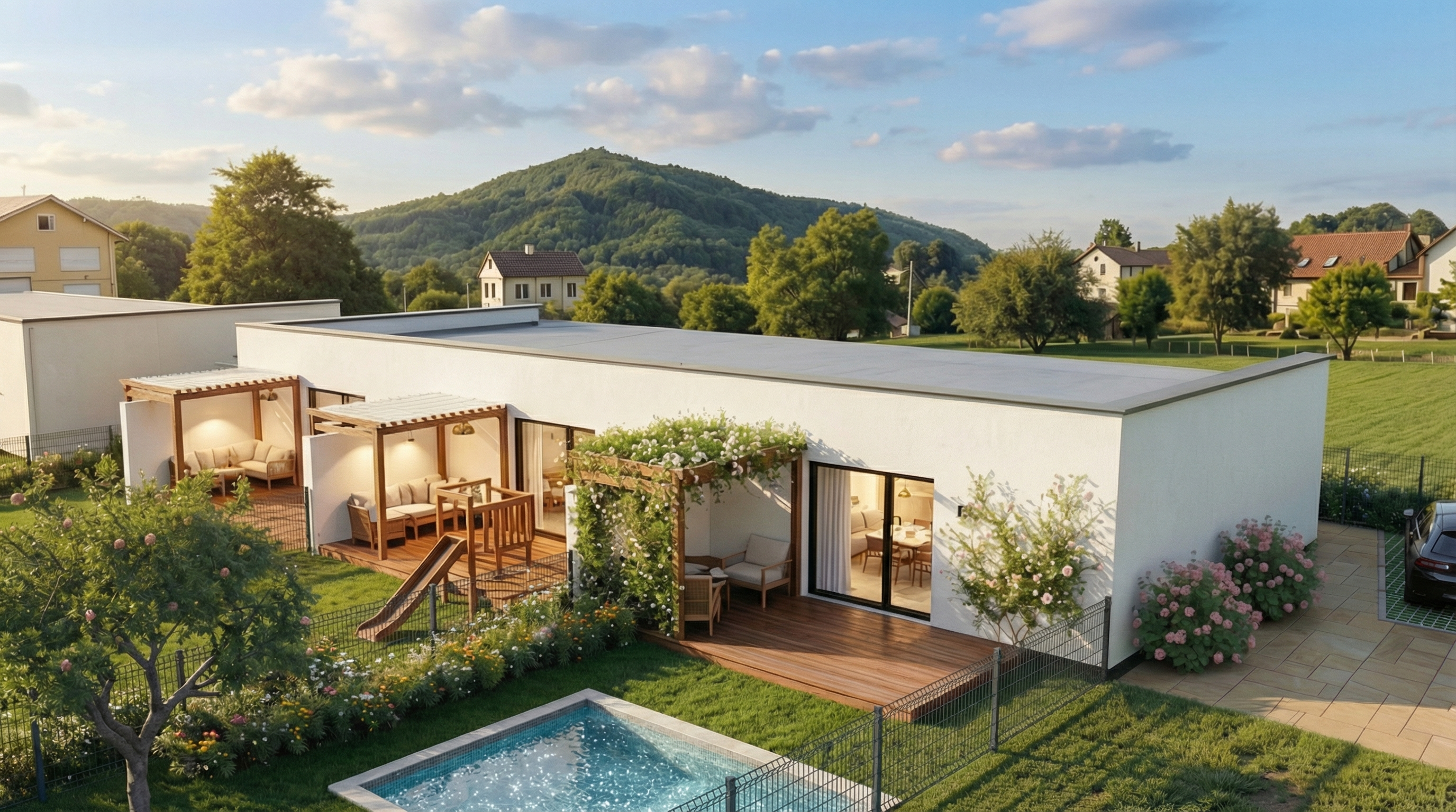 keep the image as it is but make it more realistic definitely retain the color and appearance of the wooden facade add grass where there is a lawn surface use the same colors as in the other renders
