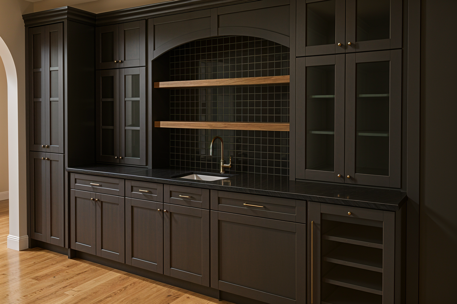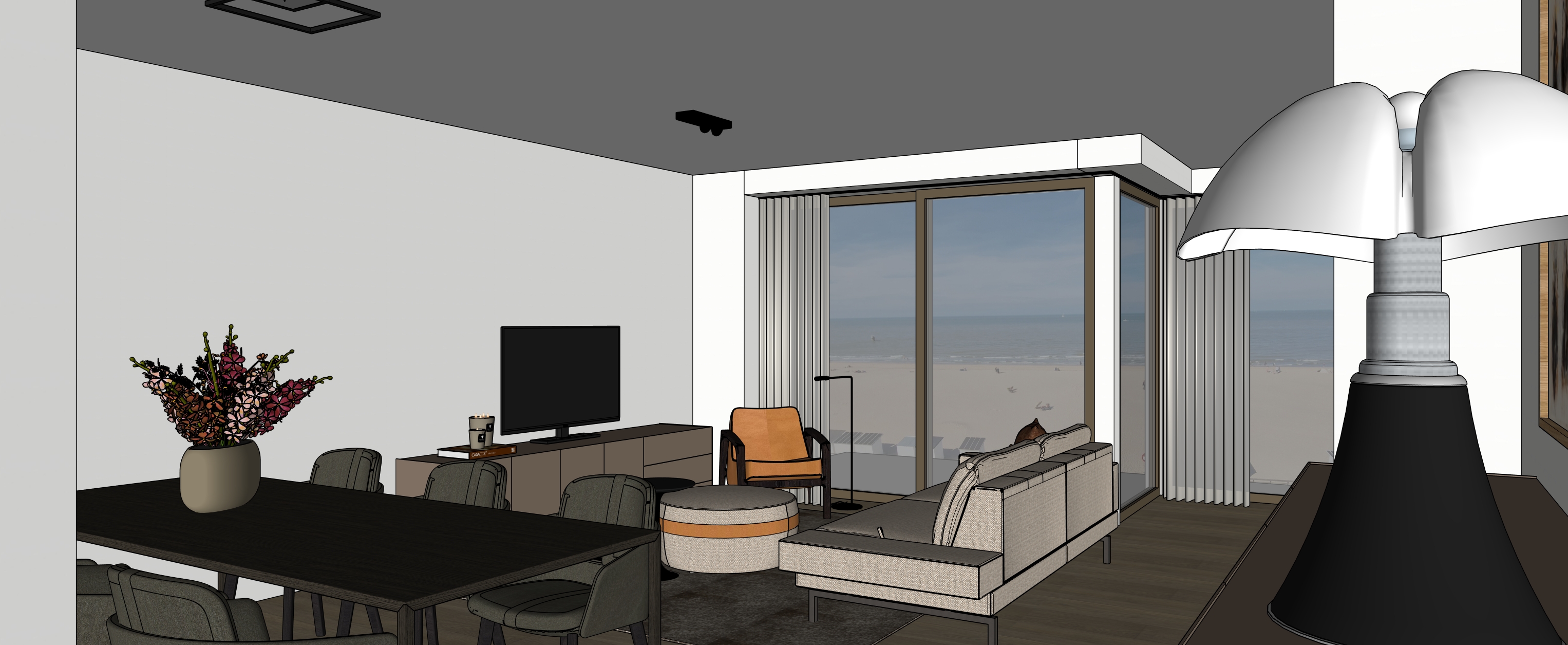 realistisch interieurbeeld warm zonlicht via het raam vloer in bleke eik kasten in matlak tafel in donkerbruin hout gordijnen semi transparant