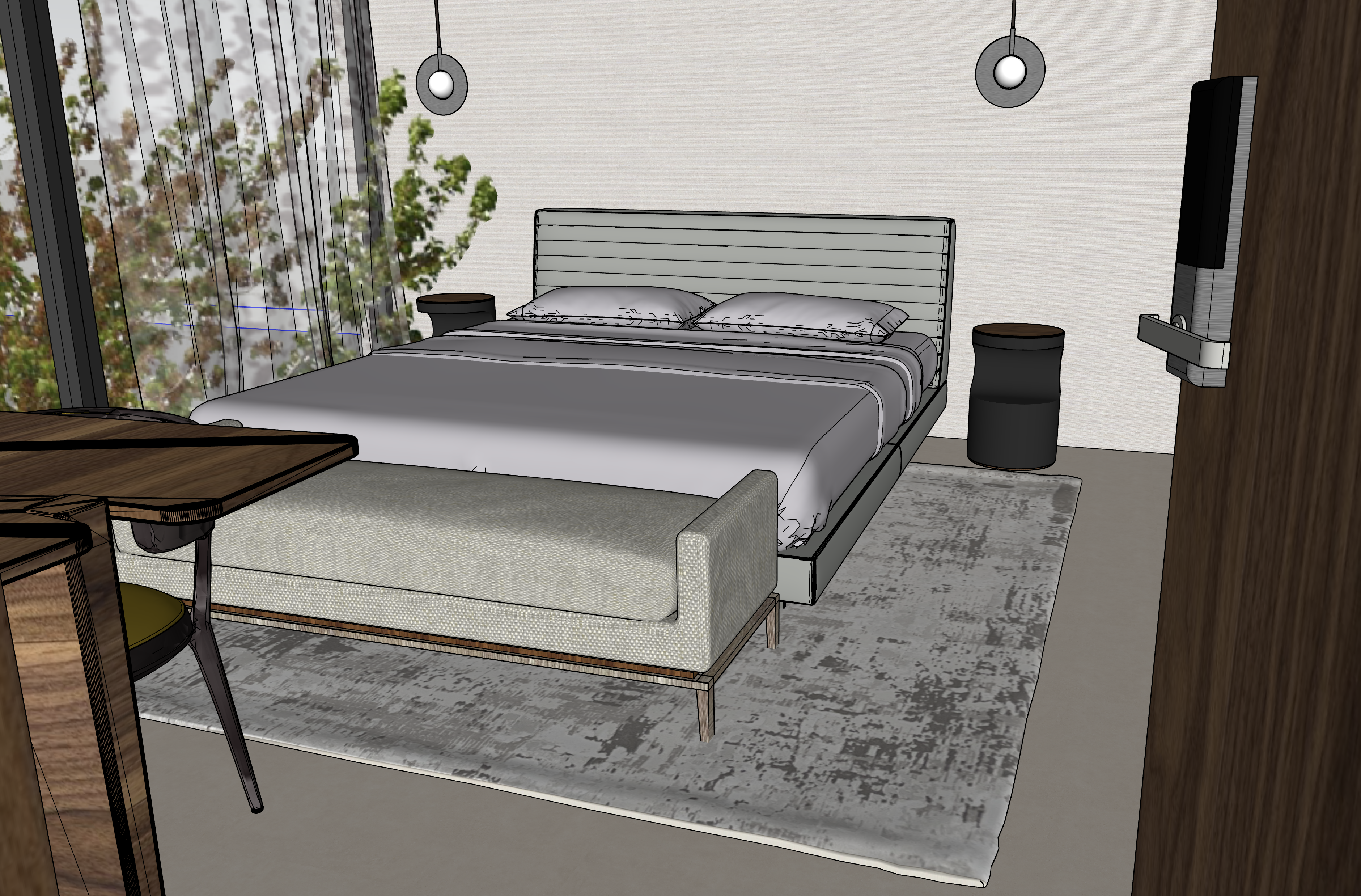 bed room from a residential minimalistic contemporary style space minotti taupe color bed wooden marble side tables silver hallow with white crystal pendant lights greyish rug over a beige color large ceramic tiles last curtain window and light entry at left side