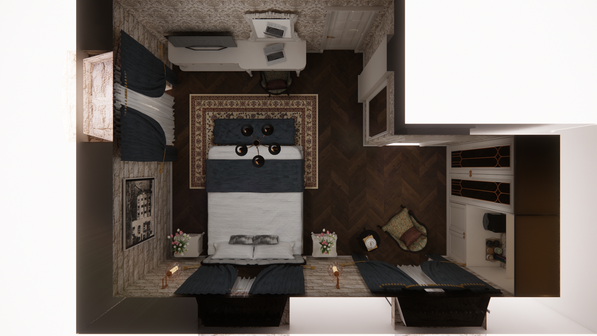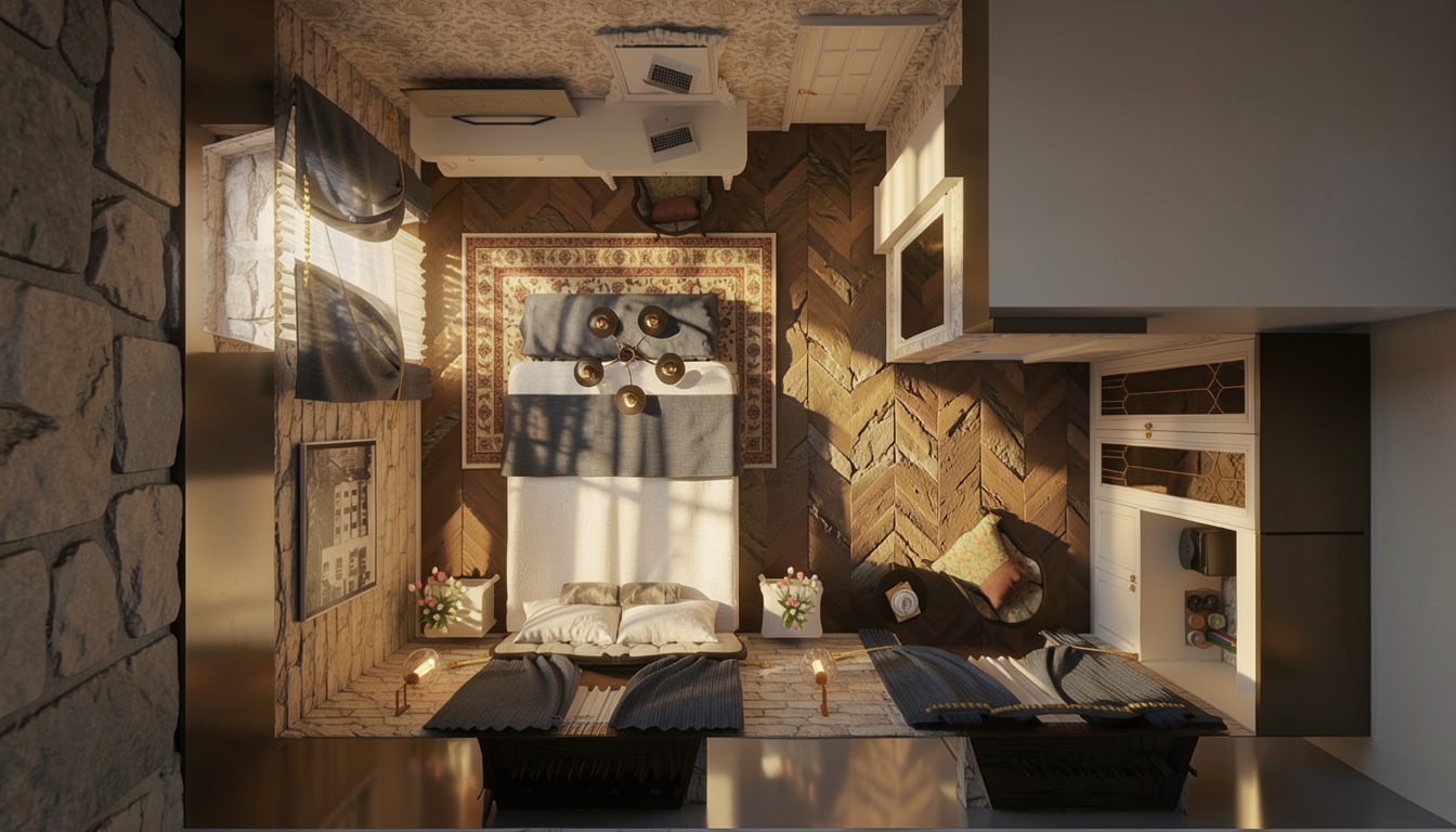 photorealistic interior scene detailed stone walls with amplified texture realism micro details roughness displacement lifelike curtains with soft fabric translucency and natural draping warm soft lighting golden hour style realistic shadows and reflections global illumination ray tracing physically based rendering pbr ultra detailed 8k maintain original colors and tones no oversaturation