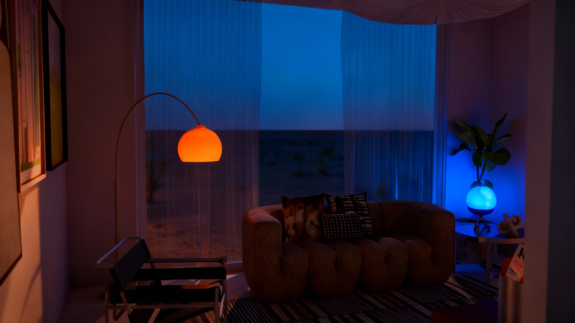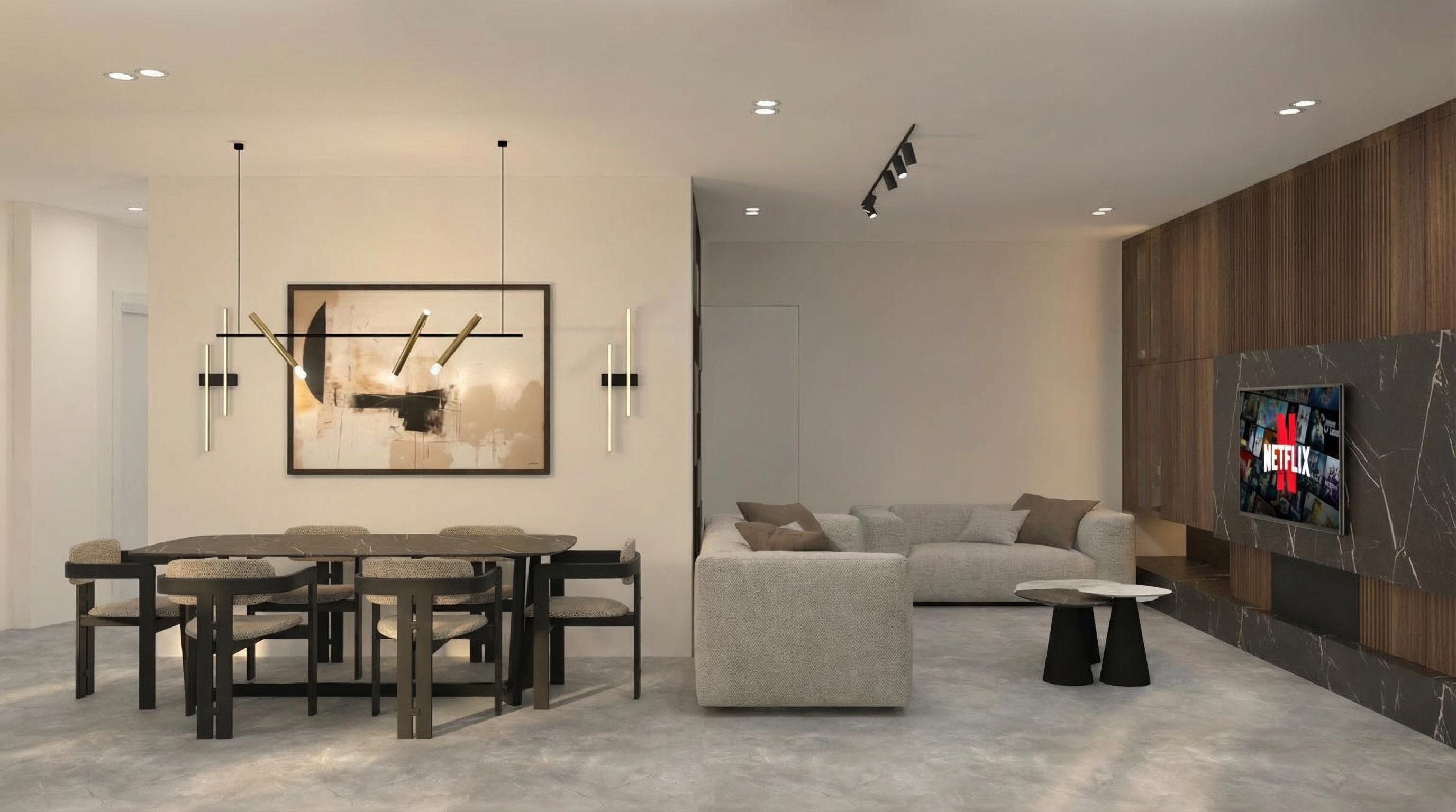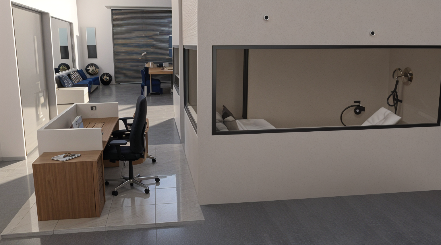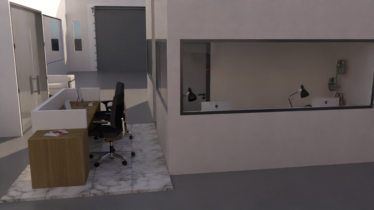 render a modern office space with a sleek and minimalist design use soft white walls and ceilings combined with a polished light gray concrete floor the desk is a warm natural oak color contrasted by black ergonomic office chairs illuminate the scene with soft natural daylight to create an inviting and calm atmosphere include a large window on the wall with a mild reflection and subtle greenery outside incorporate touches of greenery inside with small plants for a fresh feel the overall look should be clean contemporary and professional add an office space behind the glass at the front of the shot at the back near the garage door add a wheel display and a car entering the shop