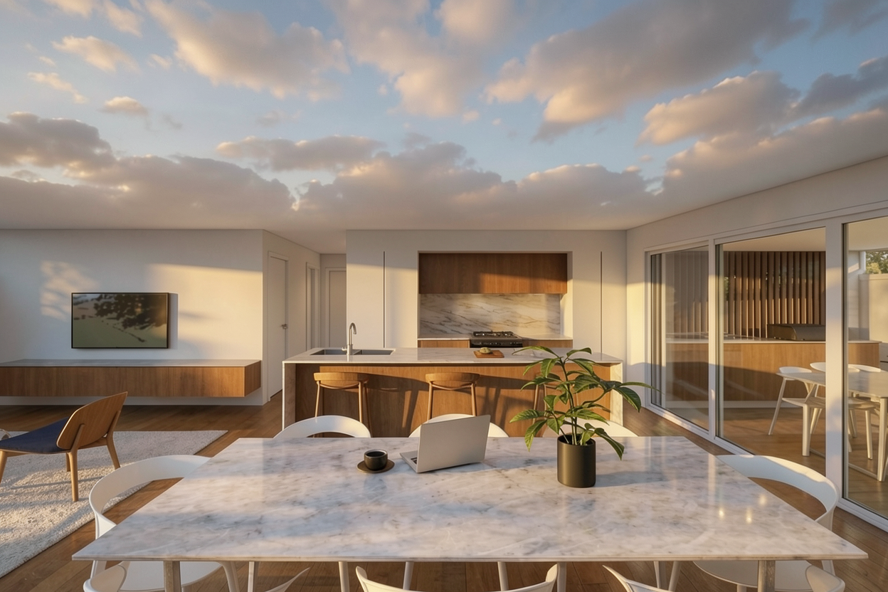 modernist exterior shot use the provided architectural model exactly as reference do not modify the architecture proportions or geometry material placement must match the design exactly material assignments garage wall natural stacked stone main house walls smooth beige stucco entry tower volume horizontal wood siding from bottom to top with no stucco interruption wall beside the front door horizontal wood siding roof fascia and trim dark charcoal metal garage door black framed glass panels the vertical entry tower must be fully clad in horizontal wood siding from the base of the wall all the way to the roof line no stucco should appear on this tower volume wood siding description modern horizontal cedar siding warm natural brown tone visible grain consistent board spacing subtle variation between planks explicit restriction no stucco on the tower no stone on the tower tower material is entirely wood siding stone description natural stacked desert stone only on the garage wall lighting bright palm springs midday sun with neutral daylight color balance environment palm springs residential neighborhood with desert landscaping agave plants gravel ground cover concrete driveway curb and asphalt street sky deep blue desert sky with thin wispy cirrus clouds camera professional architectural real estate photograph full frame dslr 35mm lens f 8 iso 100 rendering style ultra photorealistic architectural photography with realistic materials and subtle imperfections architecture