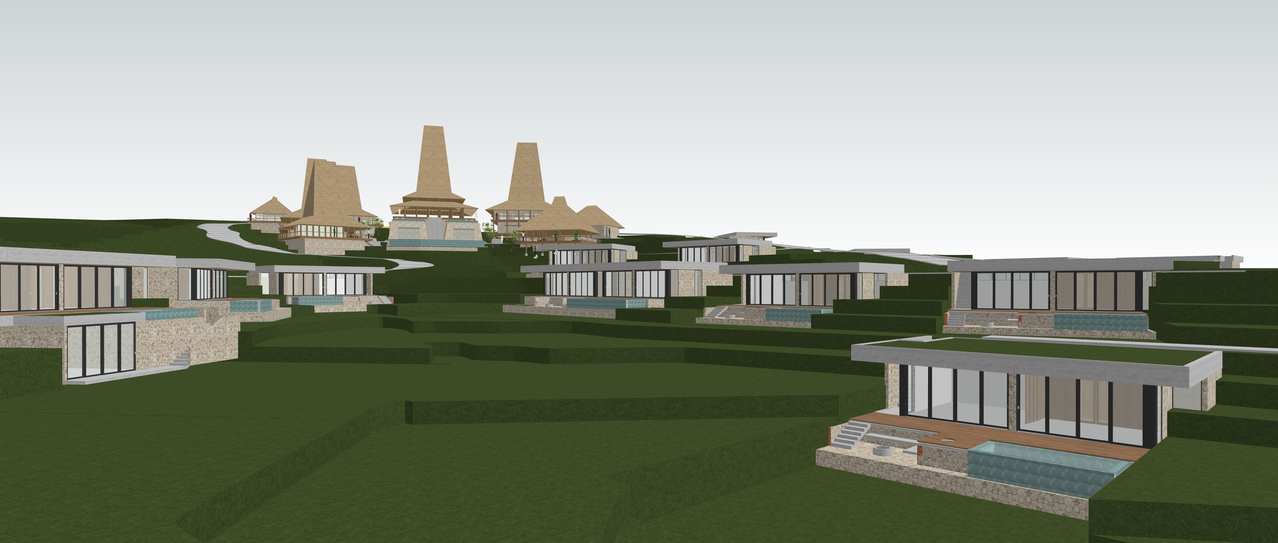 develop a realistic render from the raw 3d drawing of the villa complex in sumba island keep the exact arrangement angle and massing of every building without any changes smoothen the surrounding land contour but strictly follow the existing elevation levels shown in the 3d drawing the environment reflects sumba s natural dry landscape golden brown grasses sparse vegetation rocky soil and soft rolling terrain add subtle pathways that blend into the dry contour maintain the tent roof architectural language harmonious with the landscape use natural warm daylight tones and gentle shadows to express sumba s dry season atmosphere