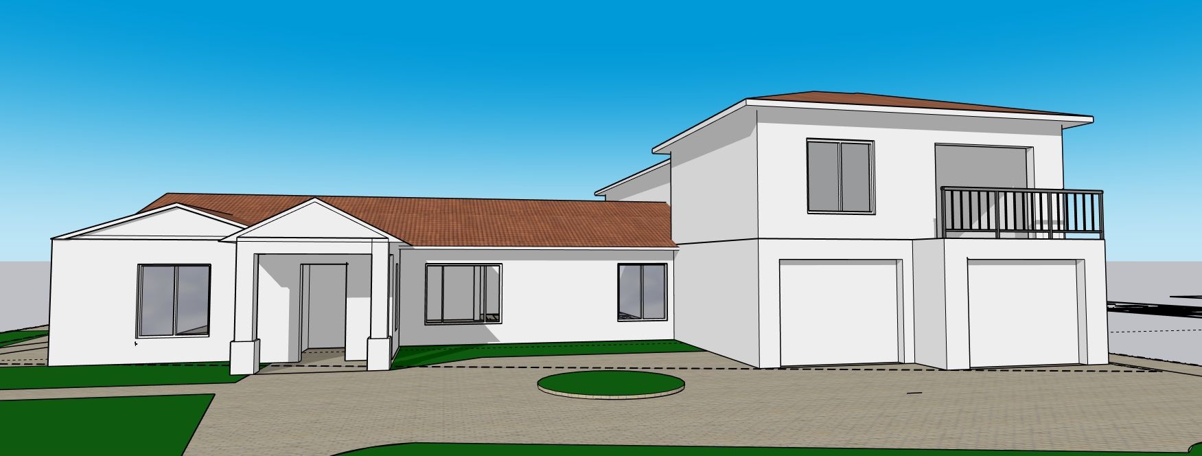 a modern two story house with a minimalist spanish style design the exterior walls are painted in crisp white complementing the sleek white window frames the roof is clad in terracotta tile adding warmth and texture surround the house with lush green grass and a neatly paved driveway made of light gray cobblestones the sky above is a clear azure blue with soft fluffy white clouds adding a serene touch the atmosphere is peaceful and inviting evoking a sense of tranquility and modern elegance tropical luxurious landscape