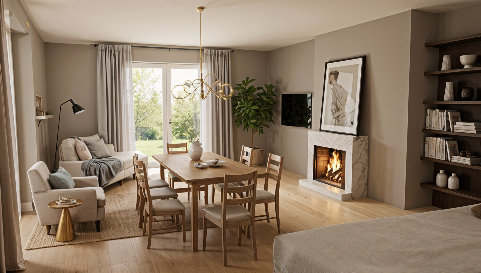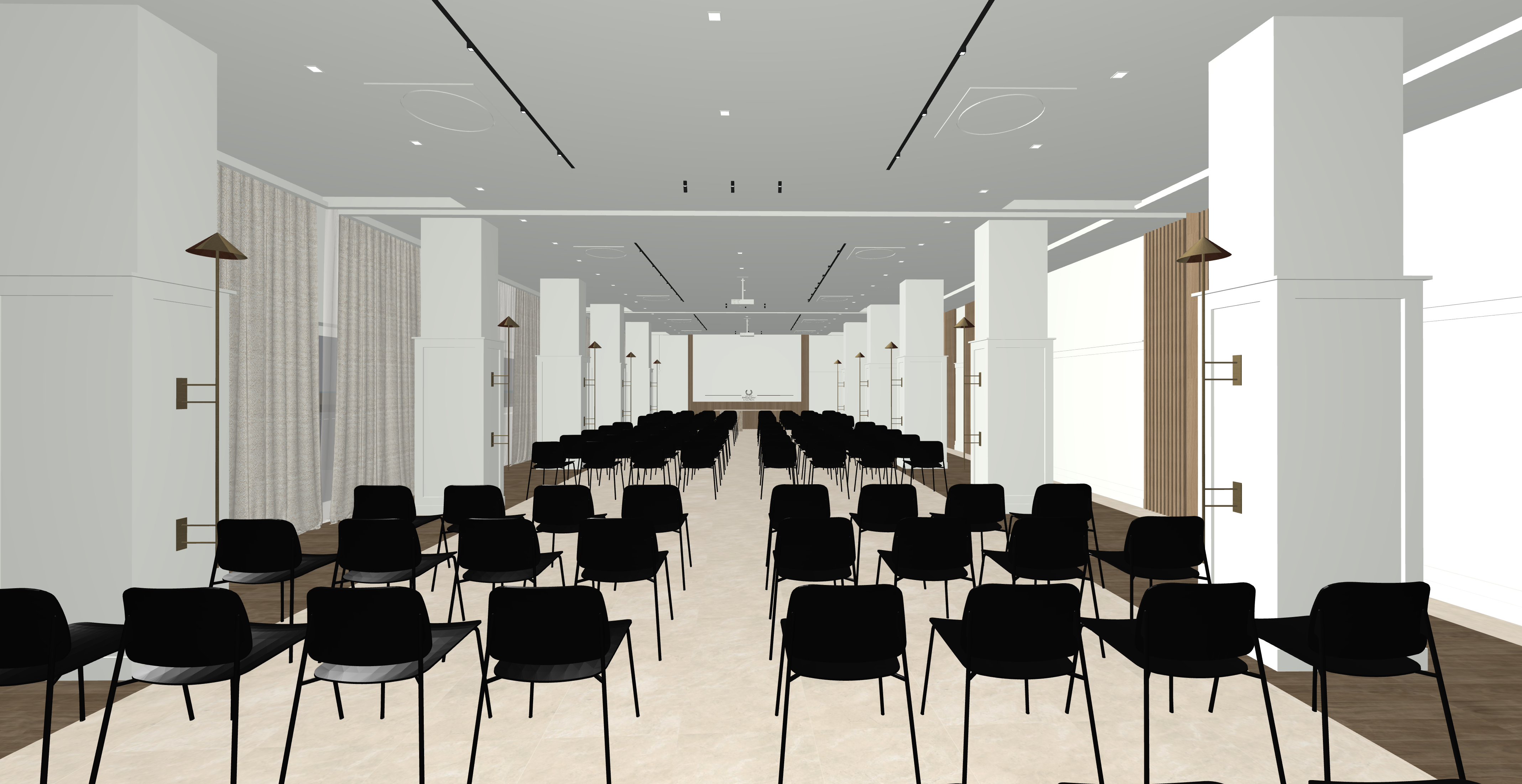 mantieni nel pavimento gres al centro e legno ai lati sedie in plastica nera opaca accendi applique nei pilastri