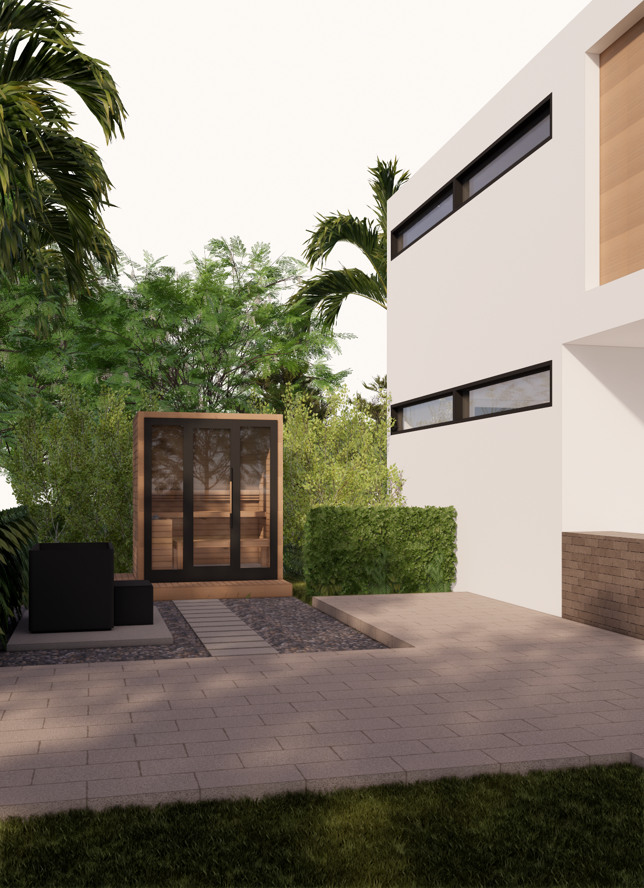 enhance the render make it look more realistic keep location and proportions of the original render enhance materials to make it look more like the first reference picture outdoor sauna