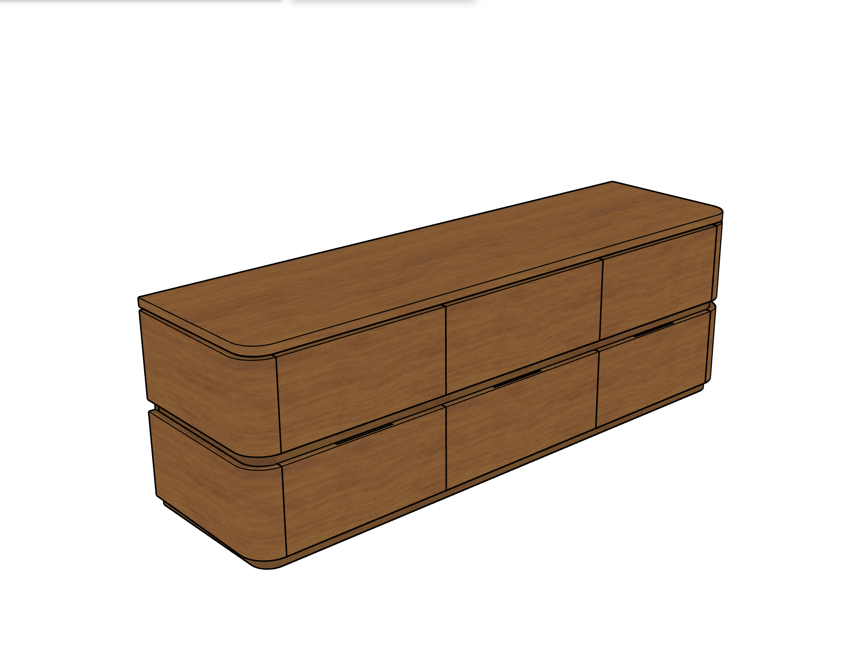 give me another version of this picture in a different wood tone a more natural oak color not rustic but more of a natural oak color do not make the stain too high gloss it should be more matt than gloss maintain the same degree of texture on the wood do not change any detail of the picture keep the background white like in the original dim the lighting slightly making it warmer the size of this 6 drawer unit is 180 cm wide 50 cm dee and 60 cm high maintain those proportions in the render the attached photo is a sketchup render but i want you to produce something more photorea listic