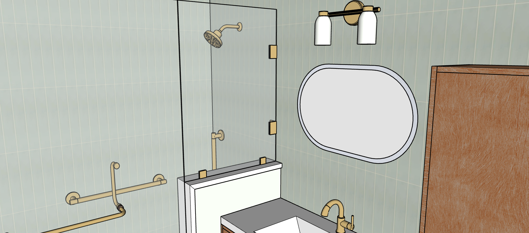 tile has a pistachio mint color with light variations on each tile for distinction lighting comes only from the vanity light with semi transparent scones 3500k and mirror backlighting the mirror has a soft white backlit halo 3500k evenly diffused there is no sunlight nor any light source other than the vanity light and backlit mirror overall scene is evenly brightened using neutral 3500k lighting only do not add highlights glow reflections or new light sources