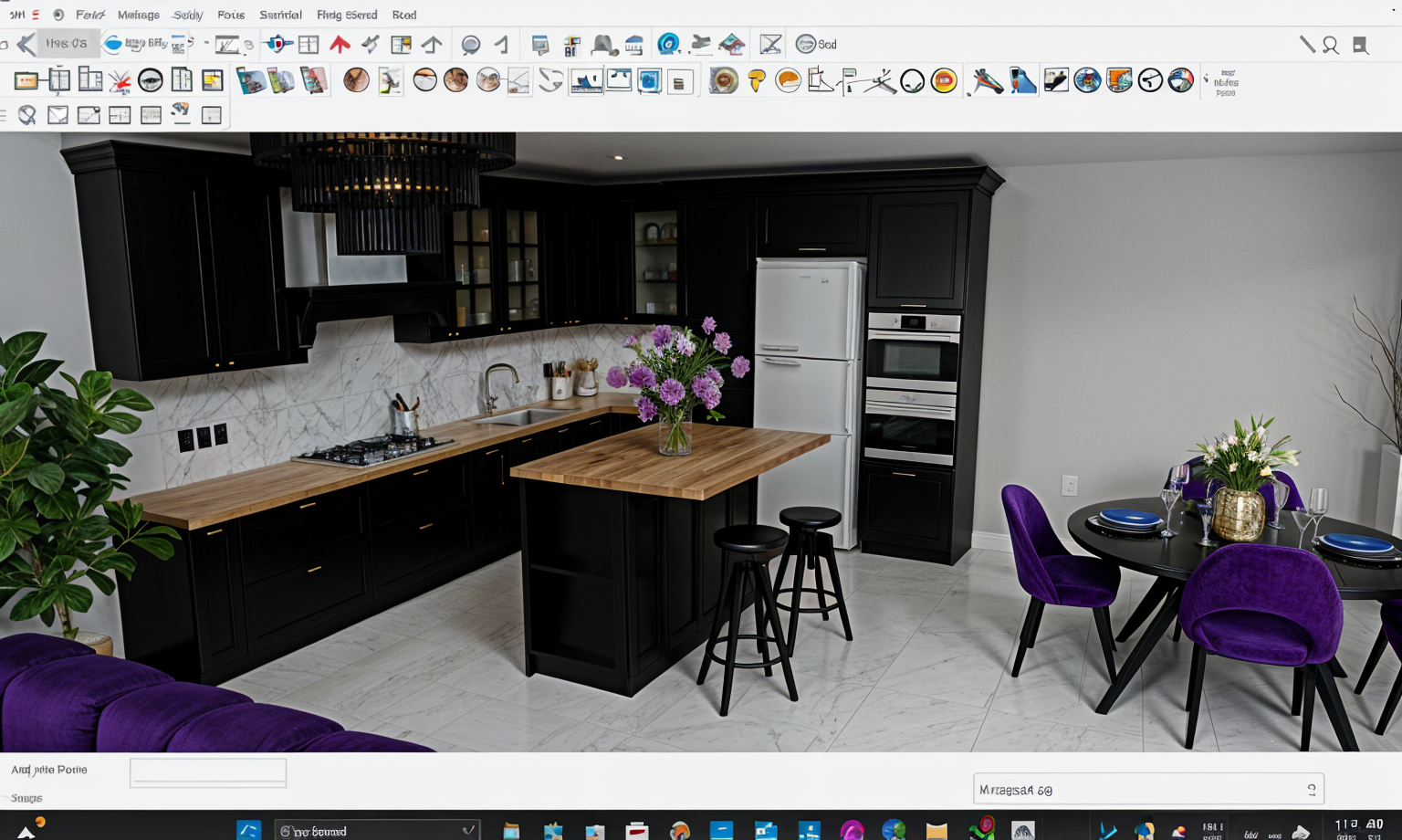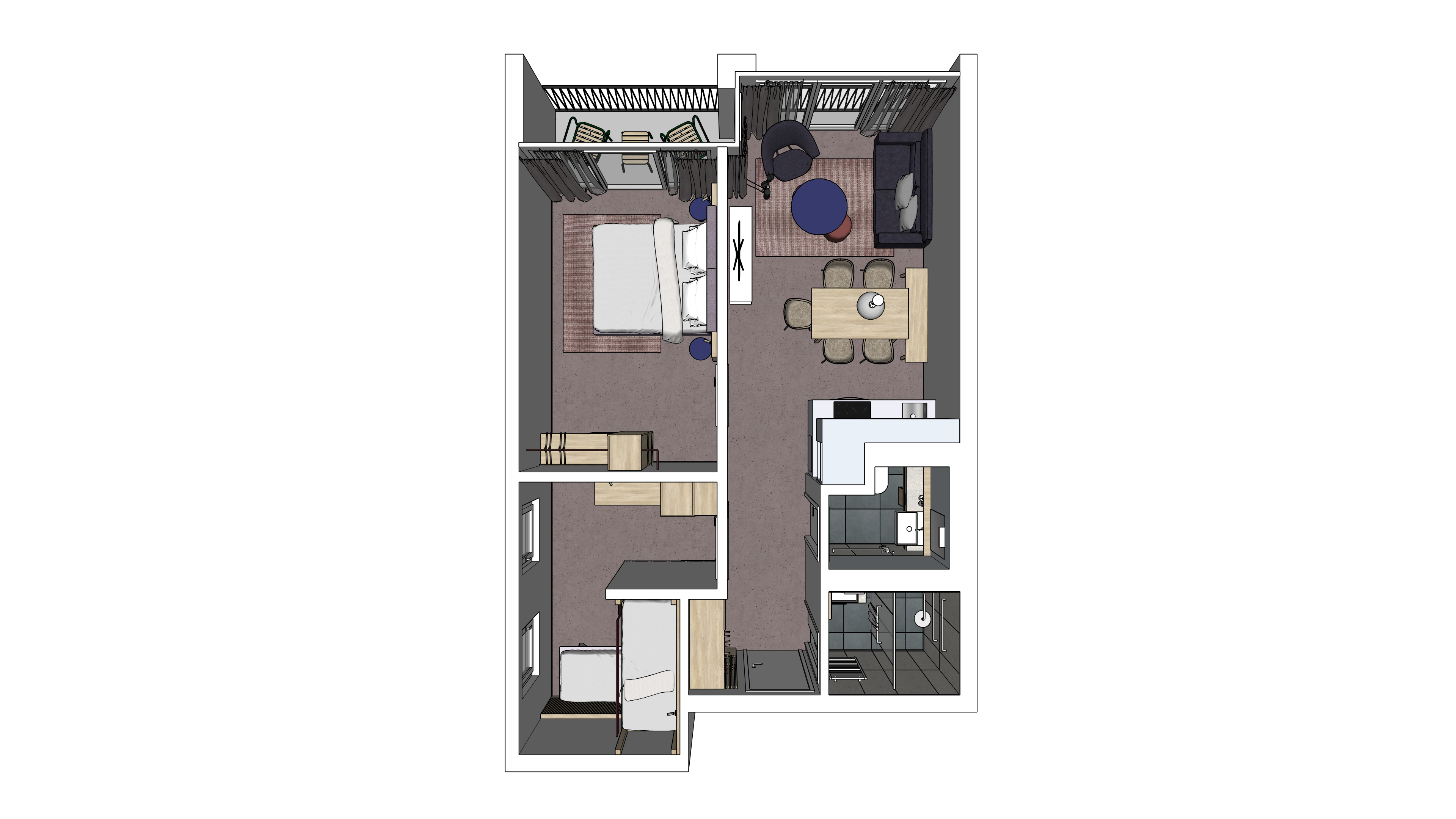 top view into a 3d floorplan from sketchup please maintain the geometry and the materials as accurate as possible create a contemporary modern style