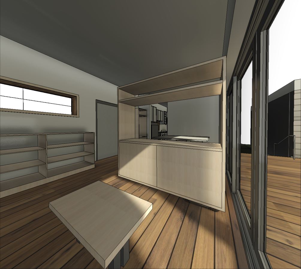 a realistic interior perspective shot of a living room with light colored casework nice hardwood floors a grey wood front door with a window and a porch outside