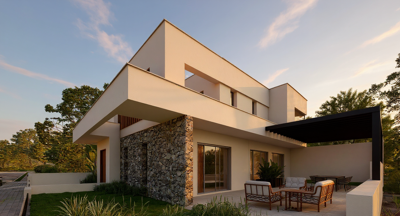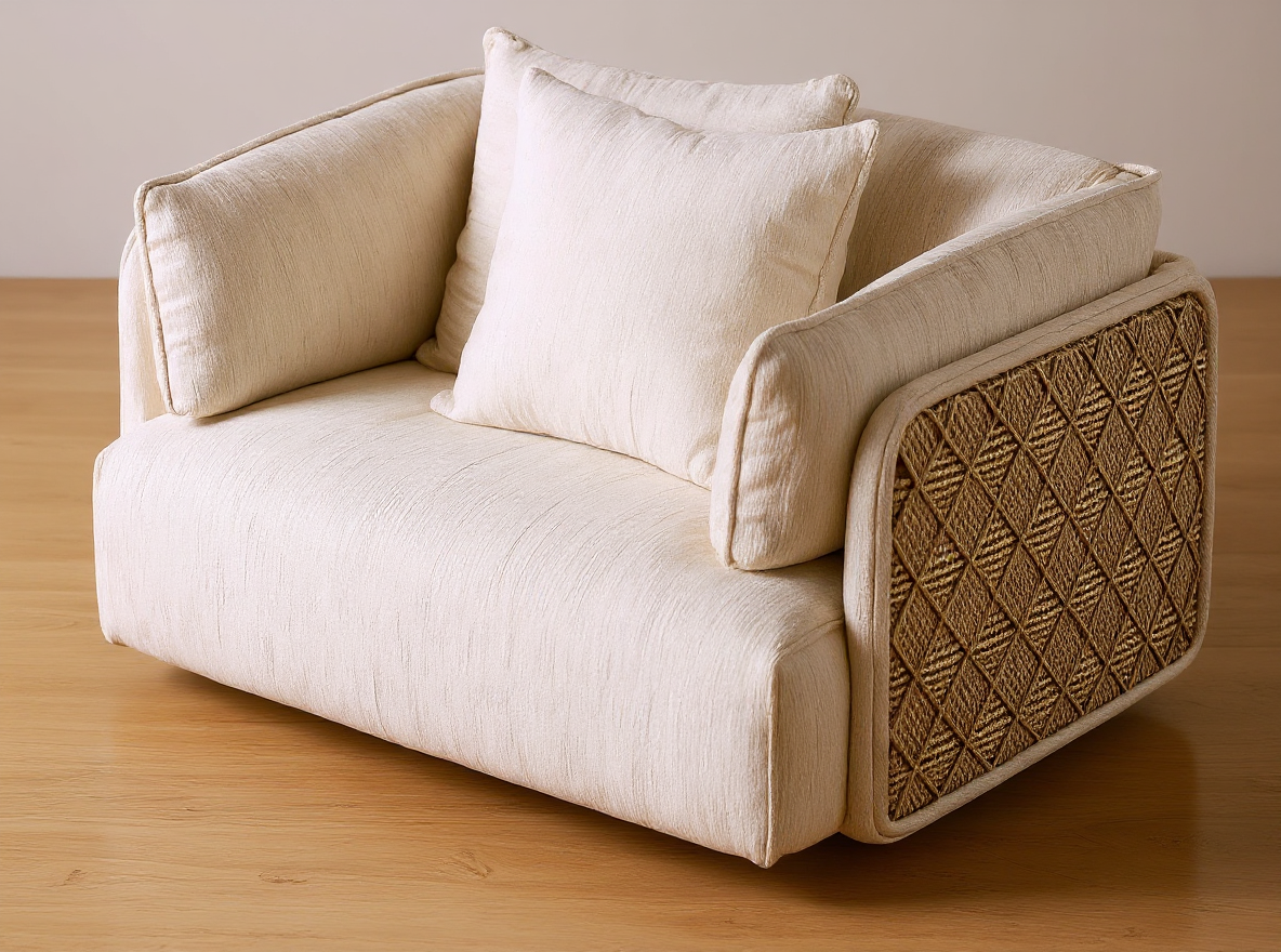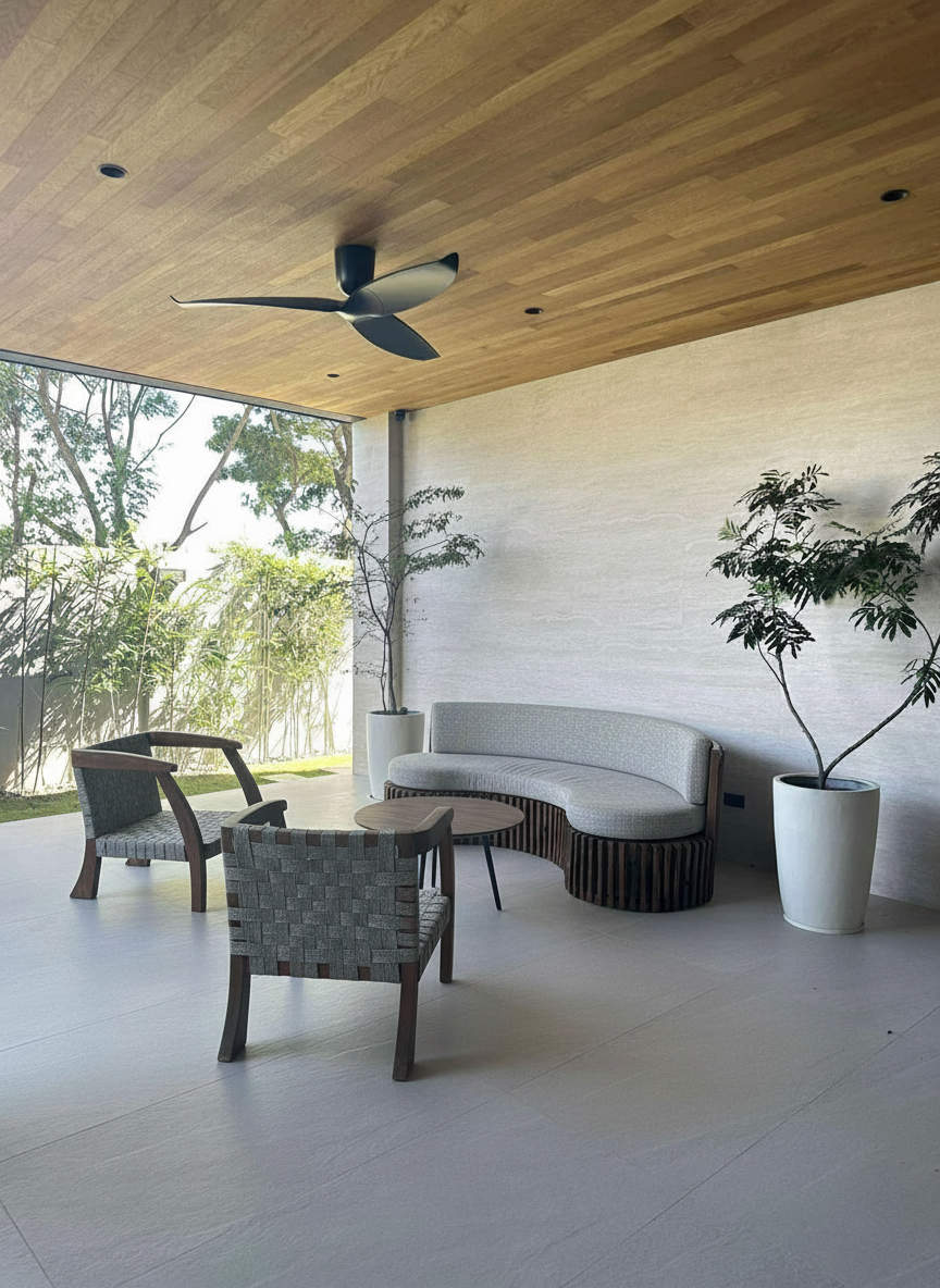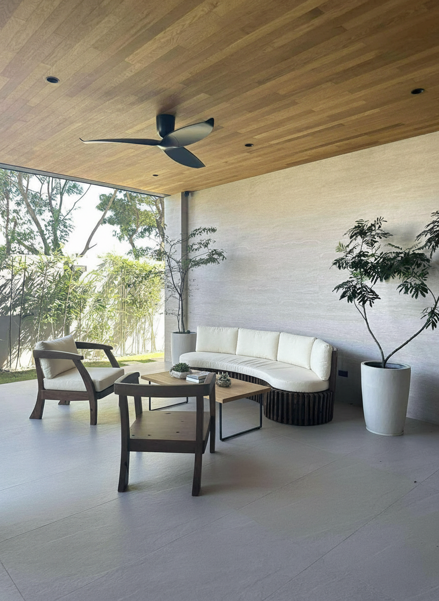 put off white upholstery on lounge chair and sofa place a round coffee table with natural stone top and tripod wood legs